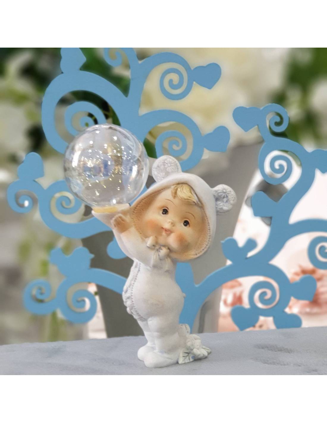 Bambino con tutina orecchie e sfera in alto bomboniere battesimo