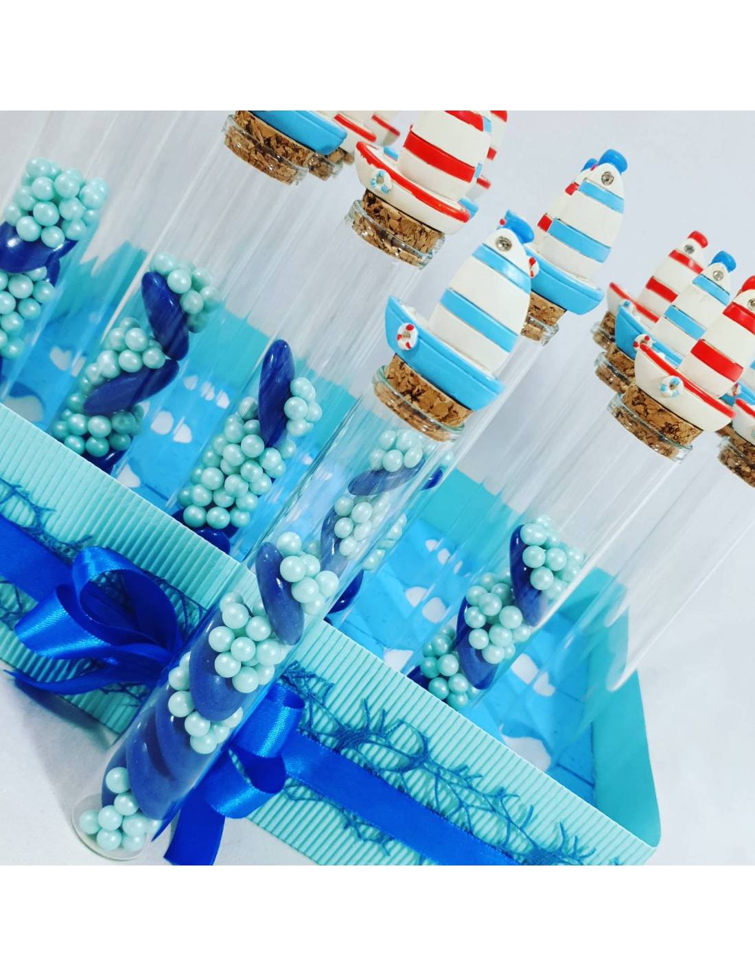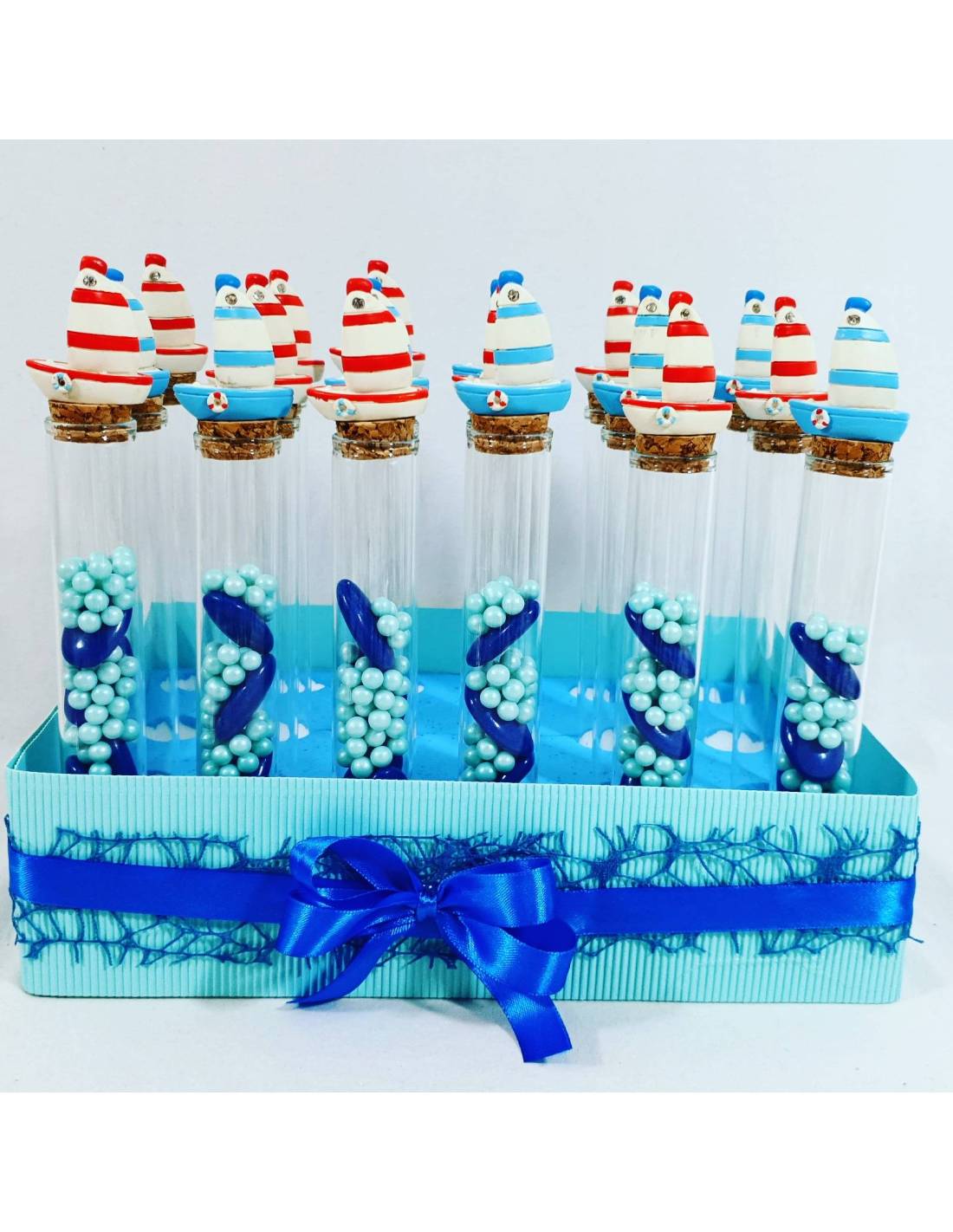 Barca a vela portaconfetti ricordo per il Battesimo maschietto con struttura composta da 24 provette in vetro contenenti confetti e, applicati sui tappi in sughero, sono presenti delle barche a vela, puoi scegliere di acquistare i confetti dai colori e gusti a scelta.