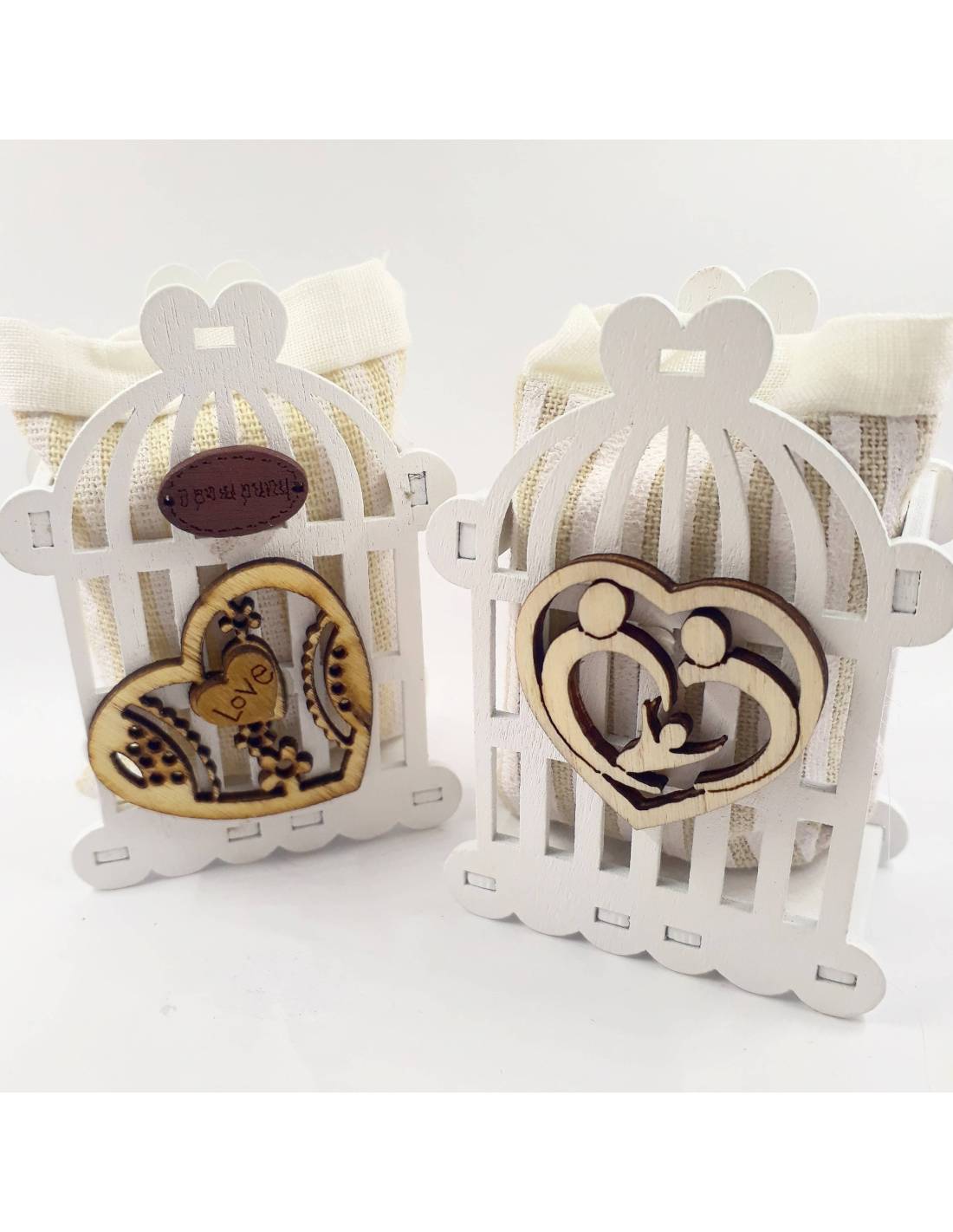 Gabbietta con 2 lati in legno e un sacchettino centrale per inserire i confetti, su un lato c'è un cuore con la scritta LOVE e sull'altro la sacra famiglia in un cuore stilizzato, ideali bomboniere sacre battesimo.