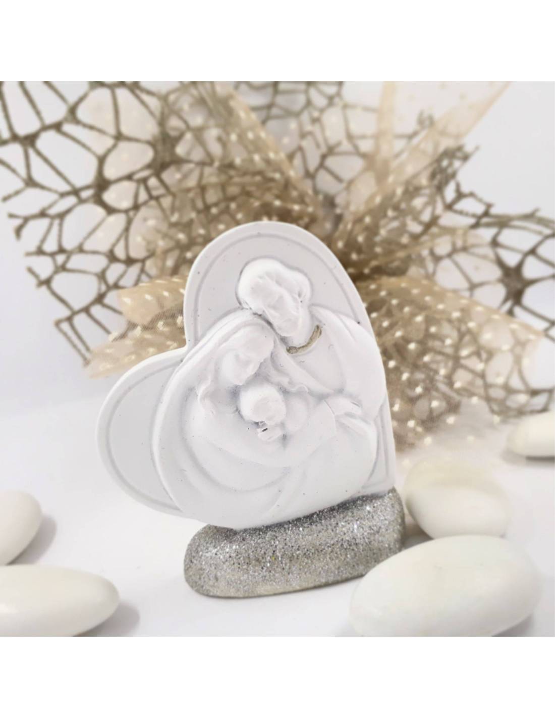 Bomboniere battesimo sacre con cuore bianco e in rilievo la sacra famiglia su un piedistallo color argento con glitter.