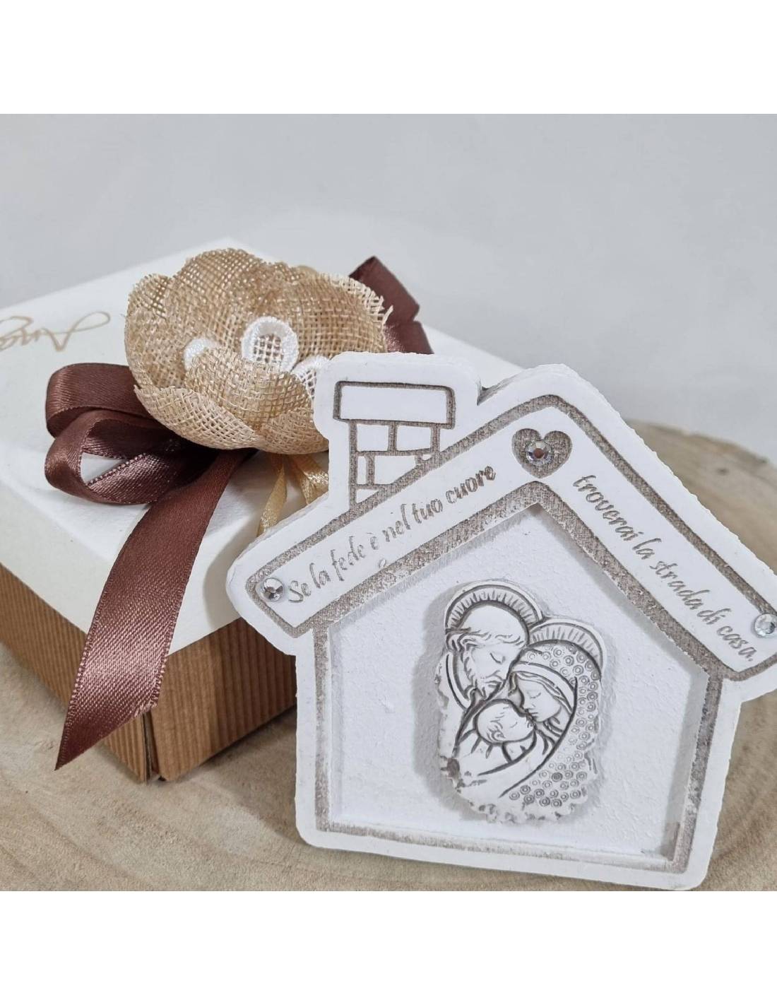 Icone per bomboniere Sacra Famiglia al centro della casetta in rilievo e sul tetto l'incisione di un cuoricino con la frase: se la fede è nel tuo cuore troverai la strada di casa.