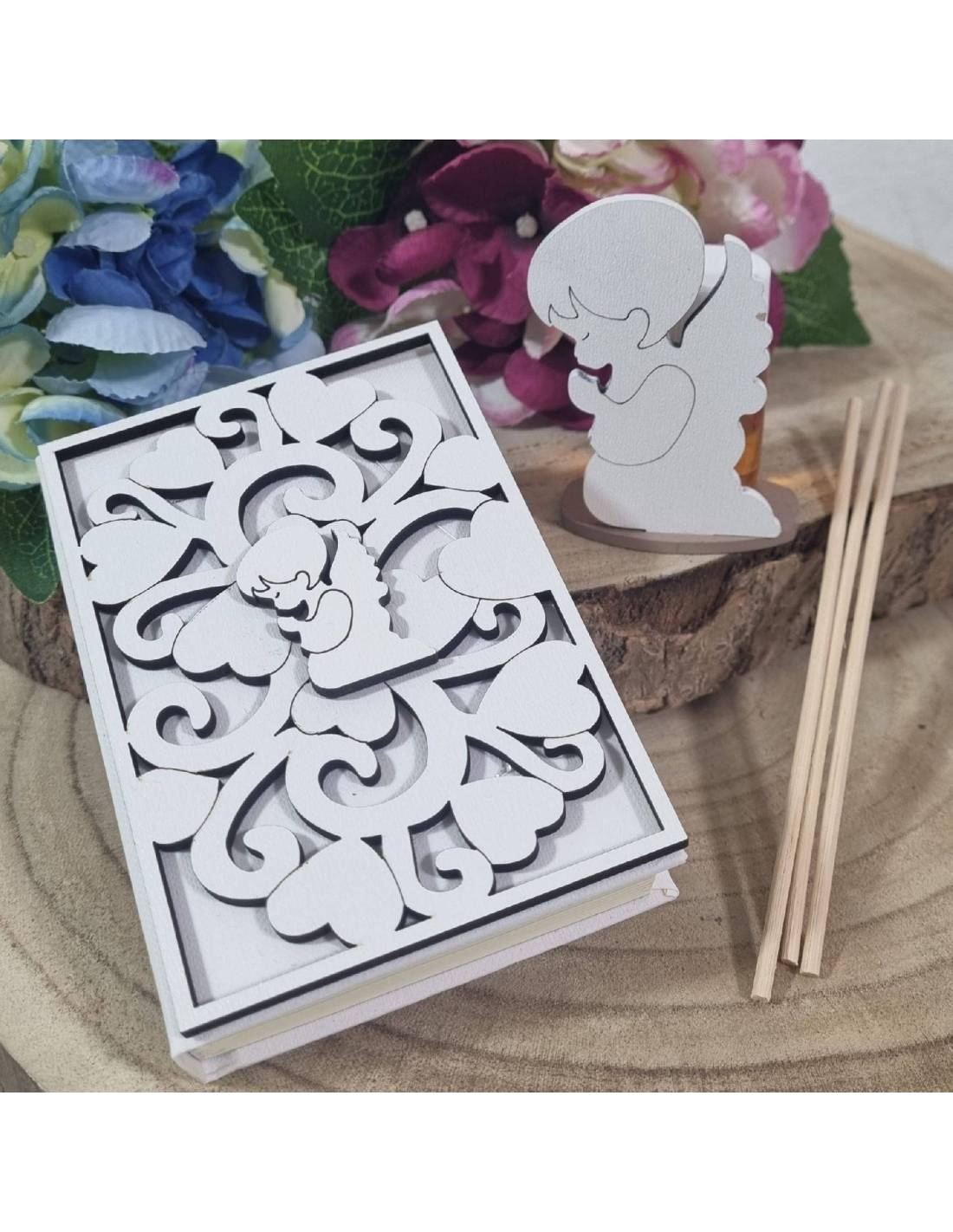 Bomboniere Battesimo immagini sacre statuetta albero della vita con rami in legno che hanno le foglie a cuore e lateralmente l'icona della sacra famiglia.