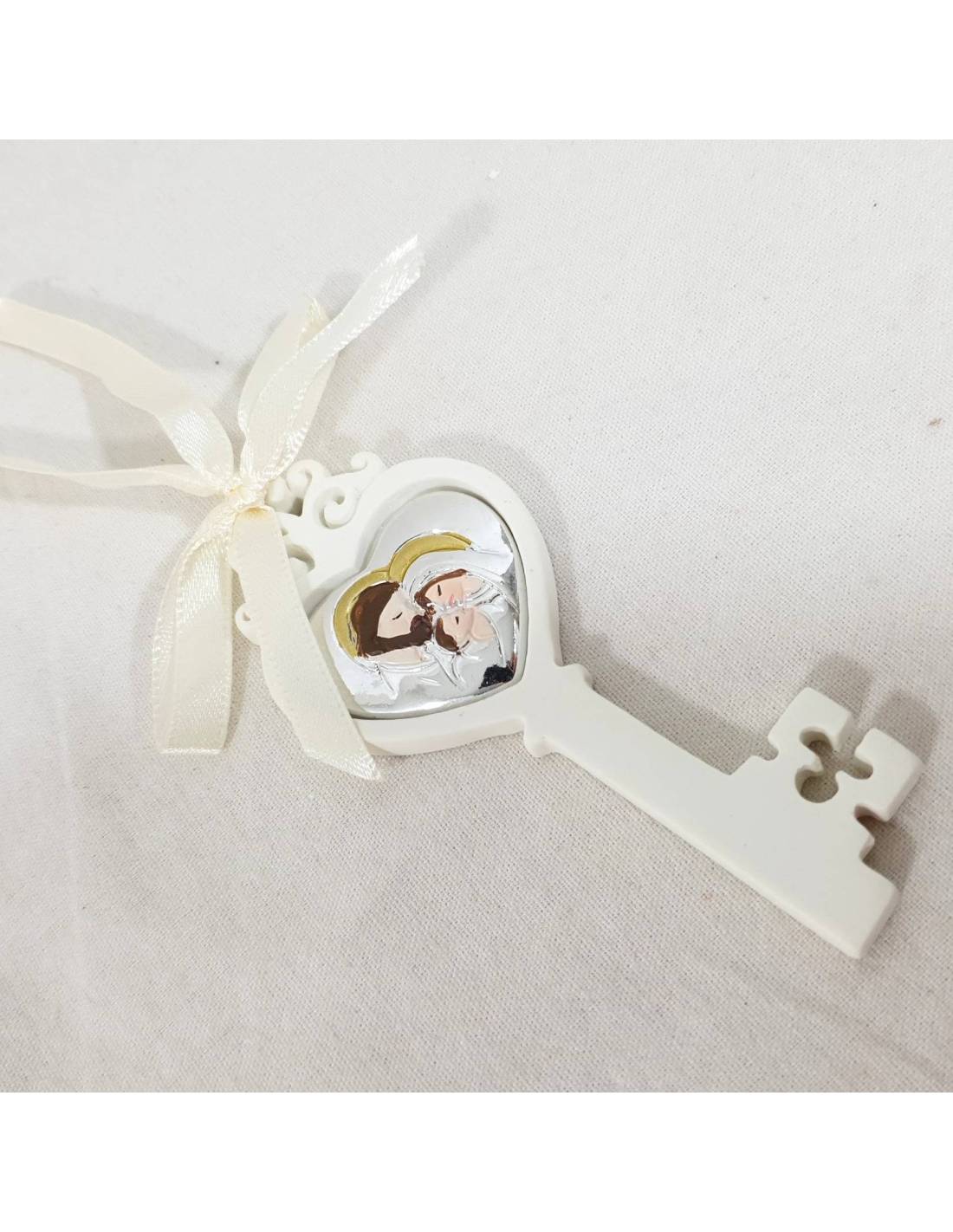 Bomboniera pendente accuratamente dipinta a mano, in resina a forma di chiave con su applicata una placca argentata raffigurante la Sacra Famiglia.