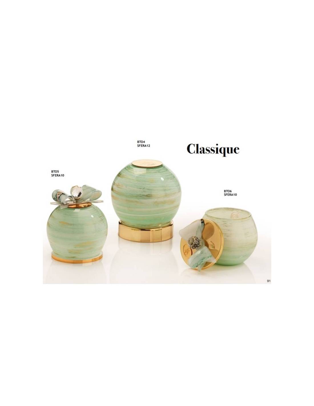 Bomboniere lampade led o candela profumata Linea Classique sfere con fantasia verde e dorata.