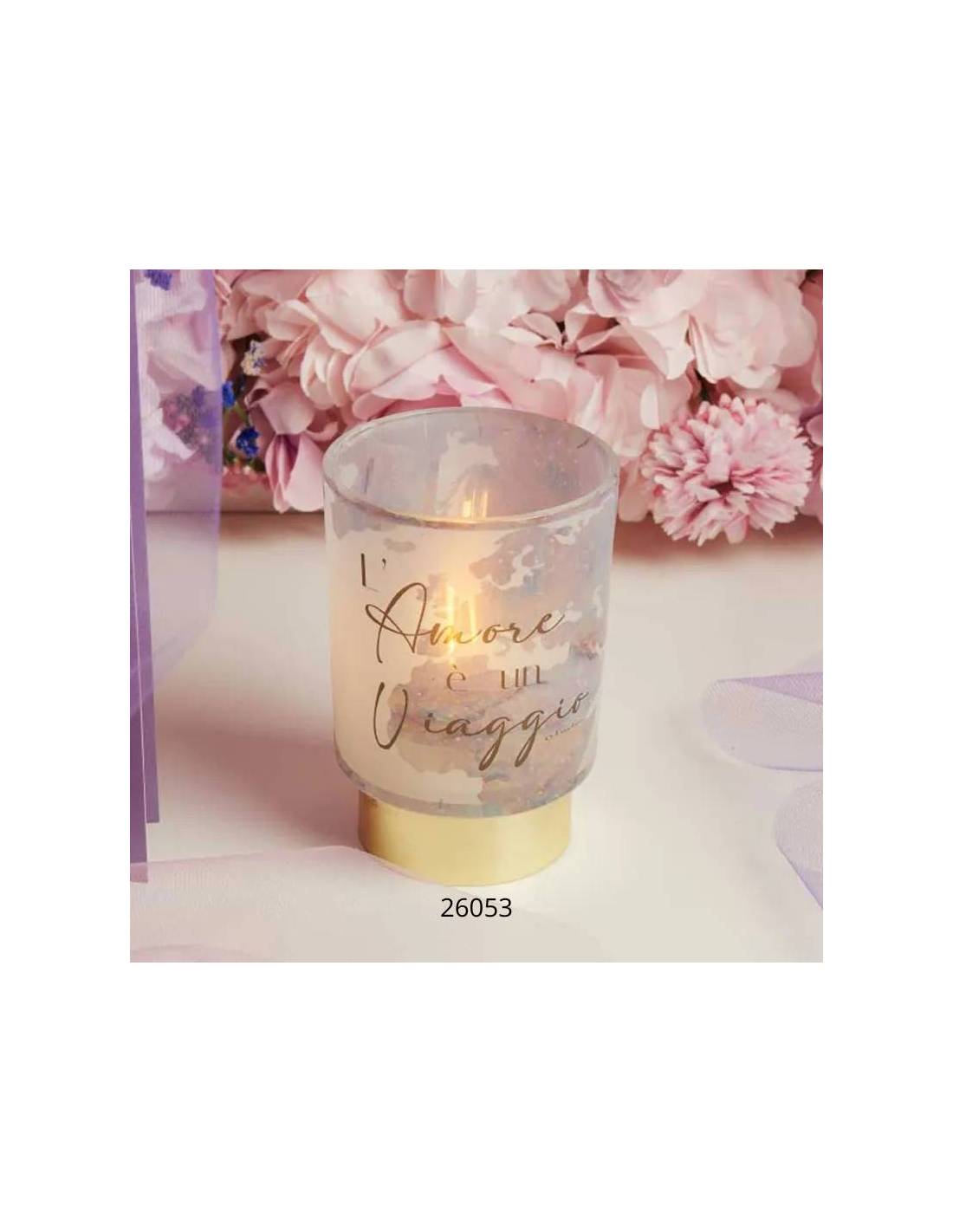 Bomboniere per Matrimonio lampada luce led tema viaggio cilindro in vetro su base dorata frase "L'amore è un viaggio".