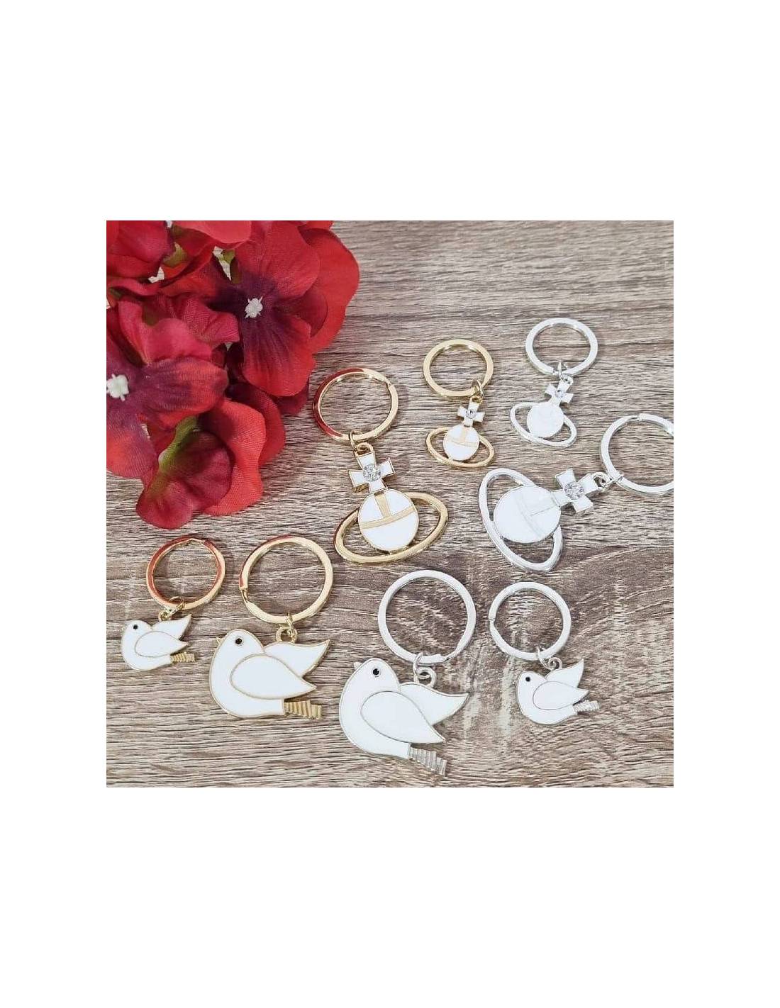 Claraluna bomboniere Comunione e Cresima portachiavi colomba e mondo croce