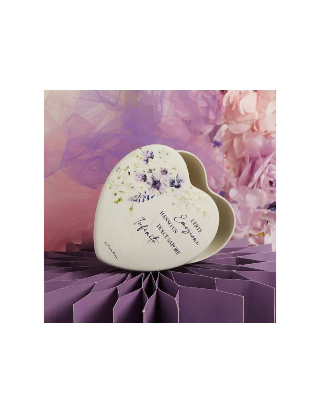 Bomboniere Matrimonio originali scatole a forma di cuore con coperchio decorato con fiori eleganti lilla e frase "Certe emozioni hanno un dolce sapore infinito".