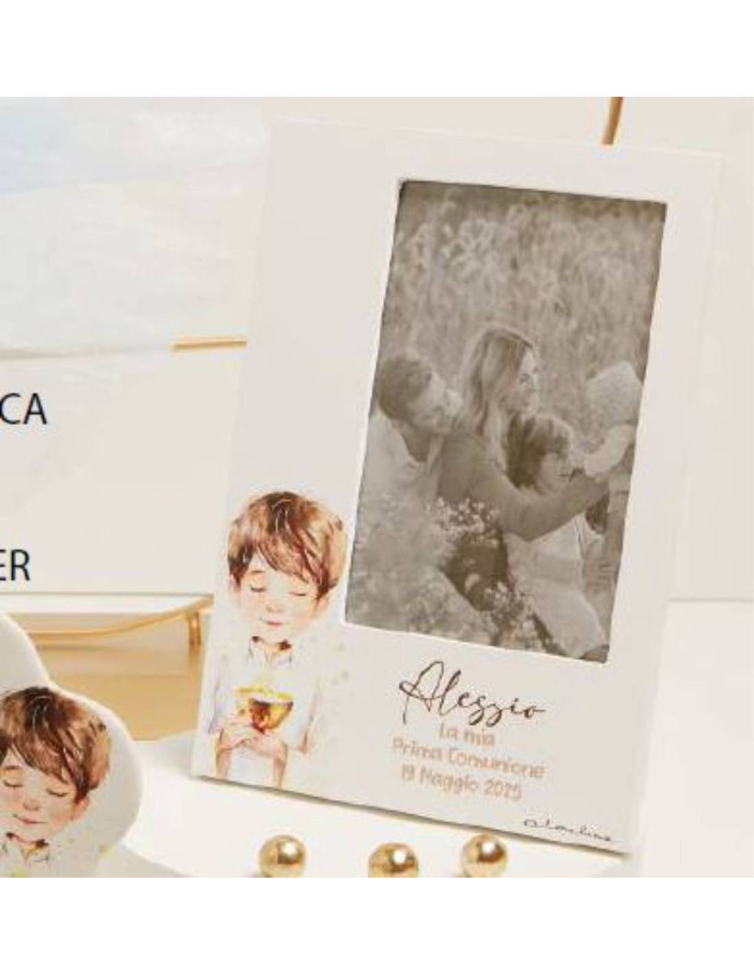 Cornice per foto Claraluna personalizzate con la stampa del nome e della data dell'evento e la frase "La mia Prima Comunione".