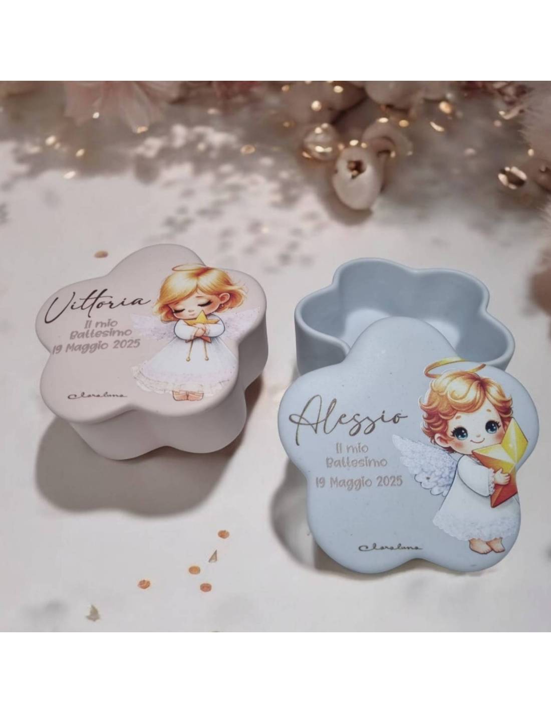 Portagioie in ceramica che hanno la stampa dell'angelo e la scritta "Il mio Battesimo".