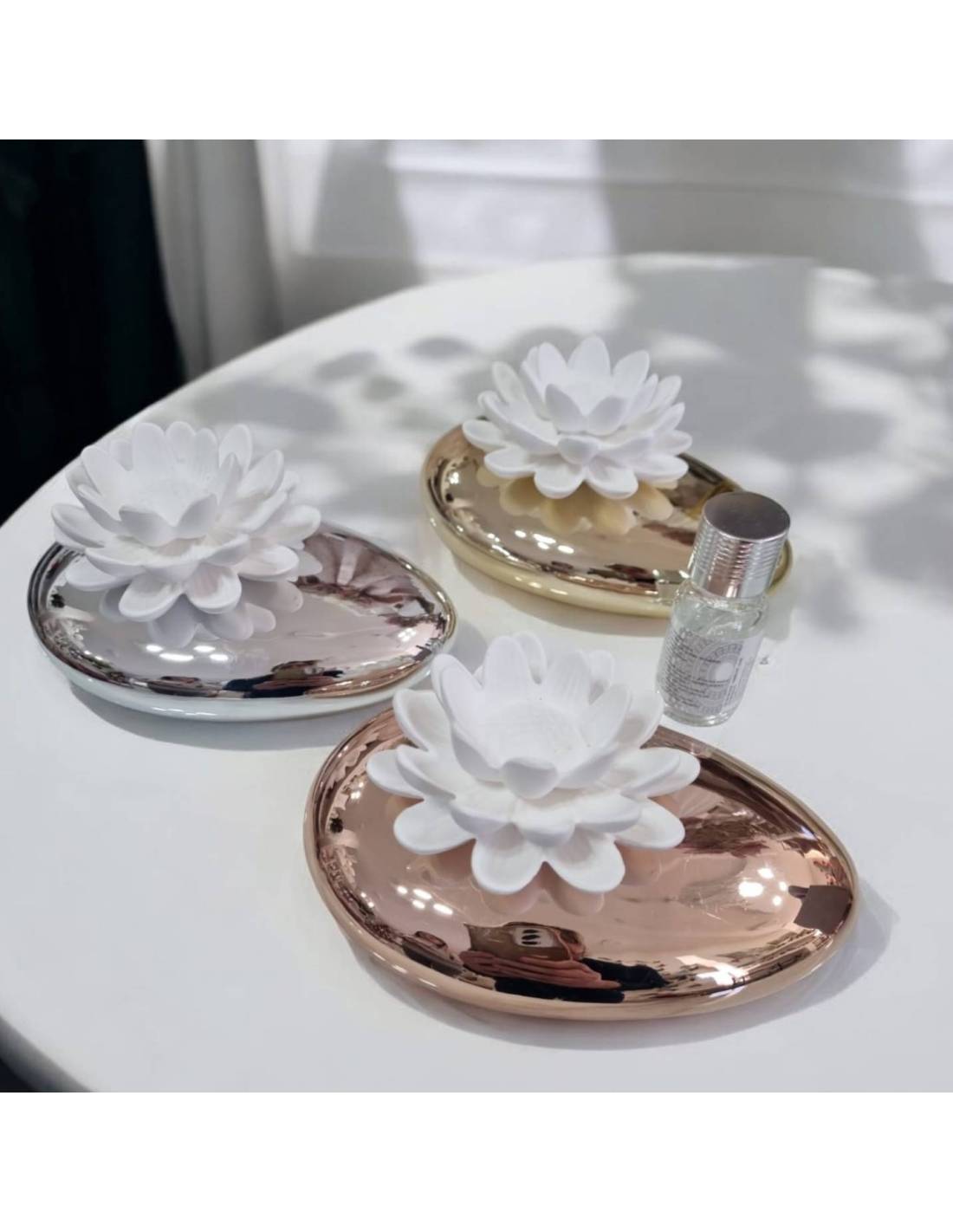 Ampolle in ceramica lucida metallizzata disponibile in tre colori con fiore di loto in gesso con stoppino per diffondere il profumo nell'ambiente.