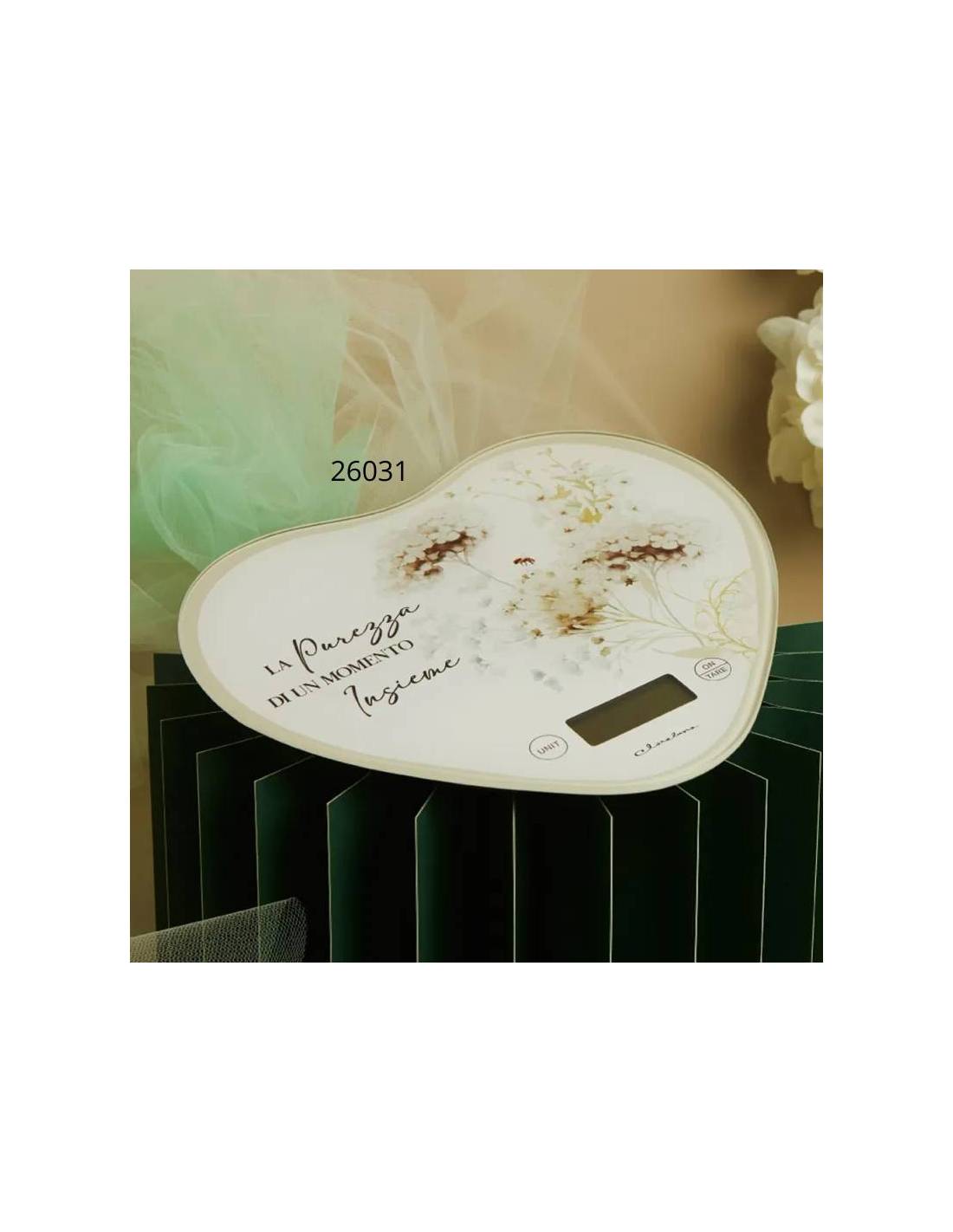 Idee bomboniere Matrimonio bilancia digitale a forma di cuore con grafica floreale e frase "La purezza di un momento insieme".