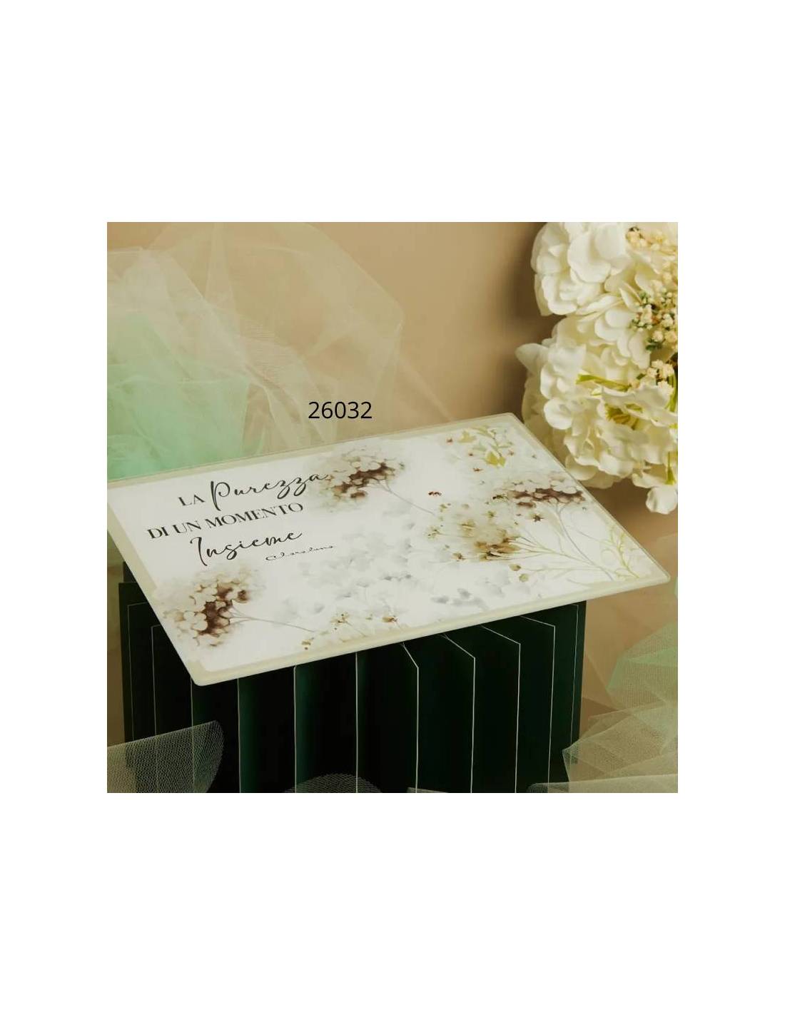 Bomboniere utili taglieri in vetro firmati Claraluna 2026 con motivo floreale verde con frase "La purezza di un momento insieme". Un ricordo raffinato e funzionale.