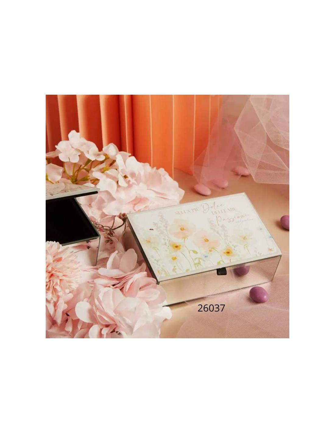 Bomboniere per Matrimonio scatola portagioie moderna e raffinata motivo floreale rosa con frase "Sei la più dolce delle mie passioni".