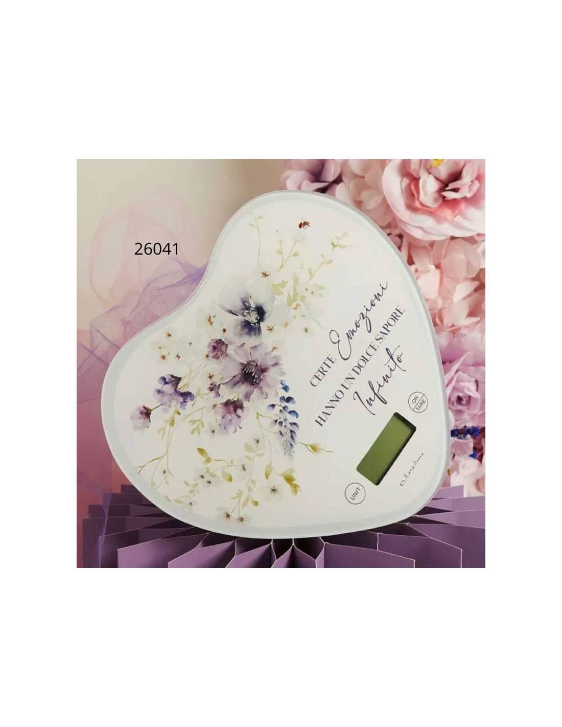Bomboniere utili bilance a forma di cuore con motivo floreale lilla e frase "Certe emozioni hanno un dolce sapore infinito".