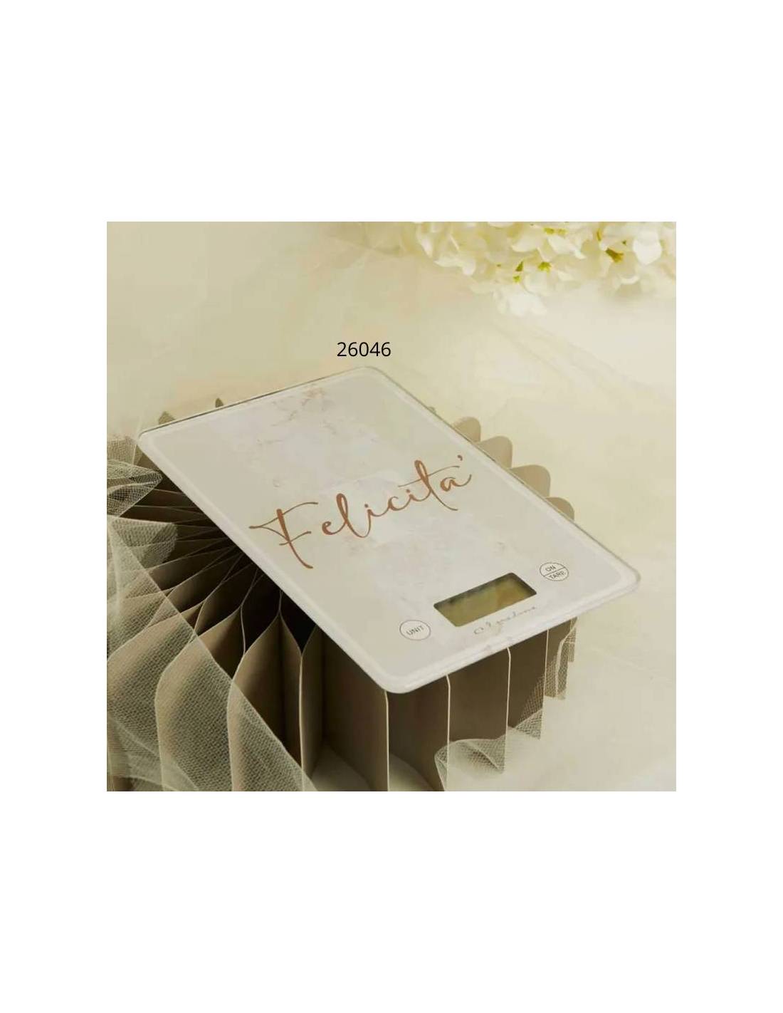 Bomboniere raffinate ed eleganti bilance rettangolari piatto in vetro temperato scritta "Felicità" display digitale con tasti ON/TARE e UNIT.