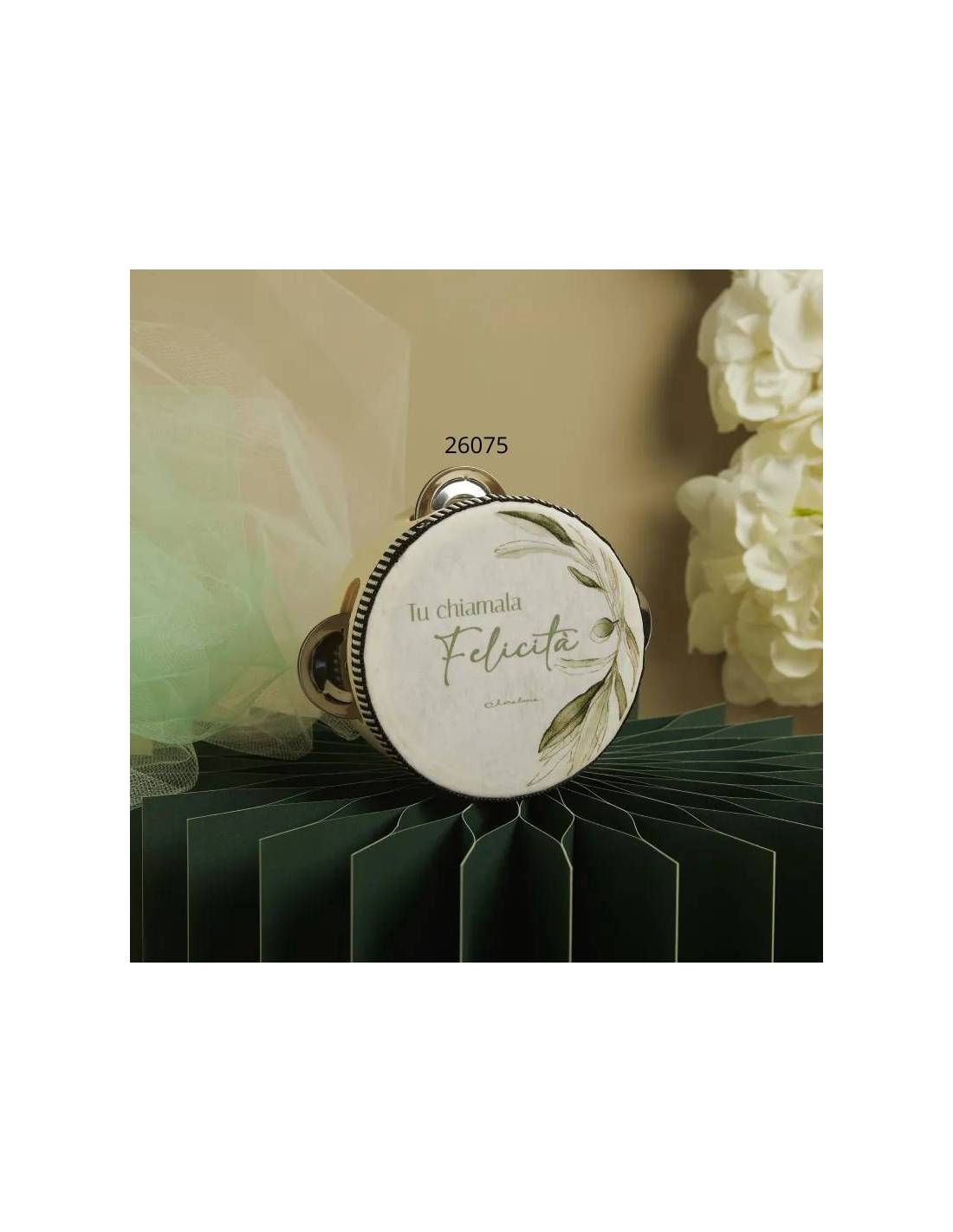 Idee bomboniere Matrimonio mediterranea tamburello Ulivo firmato Claraluna con frase "Tu chiamala felicità".