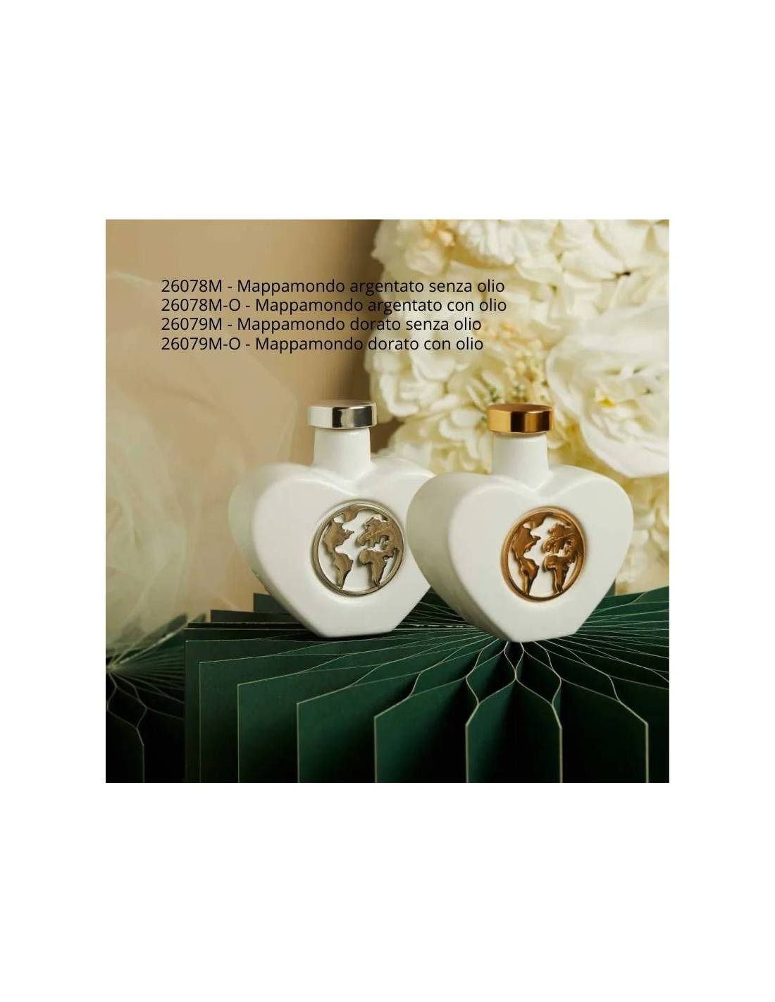 Bomboniere raffinate ed eleganti Matrimonio 2026 oliere tema viaggio a forma di cuore con icona mappamondo argentato o dorato.