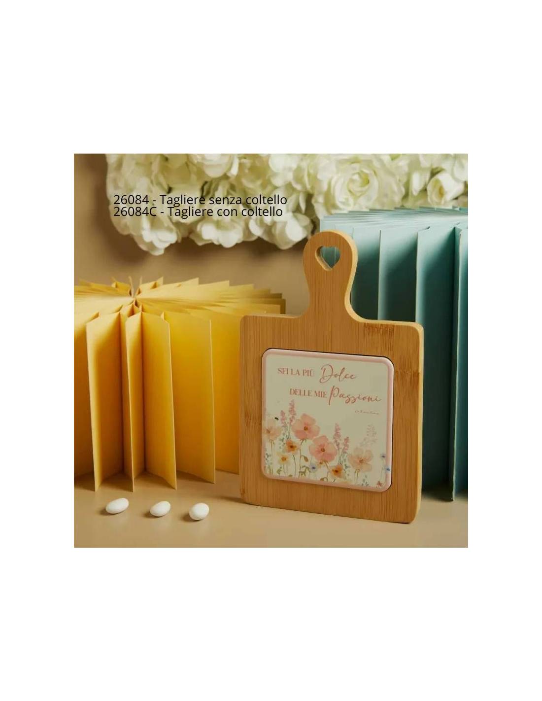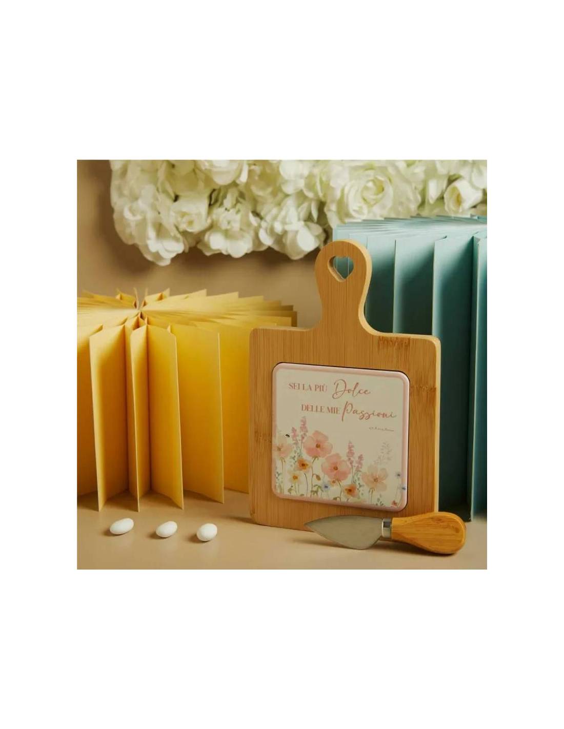 Bomboniere Matrimonio originali tagliere in bamboo con fantasia floreale rosa frase "Sei la più dolce delle mie passioni".