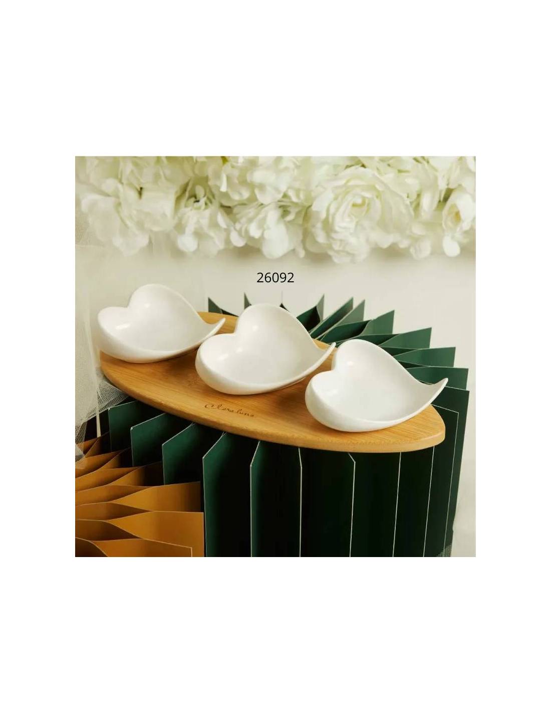 Bomboniere per Matrimonio raffinate ed eleganti vassoio in bamboo con incluse tre ciotoline in porcellana bianca a forma di cuore.