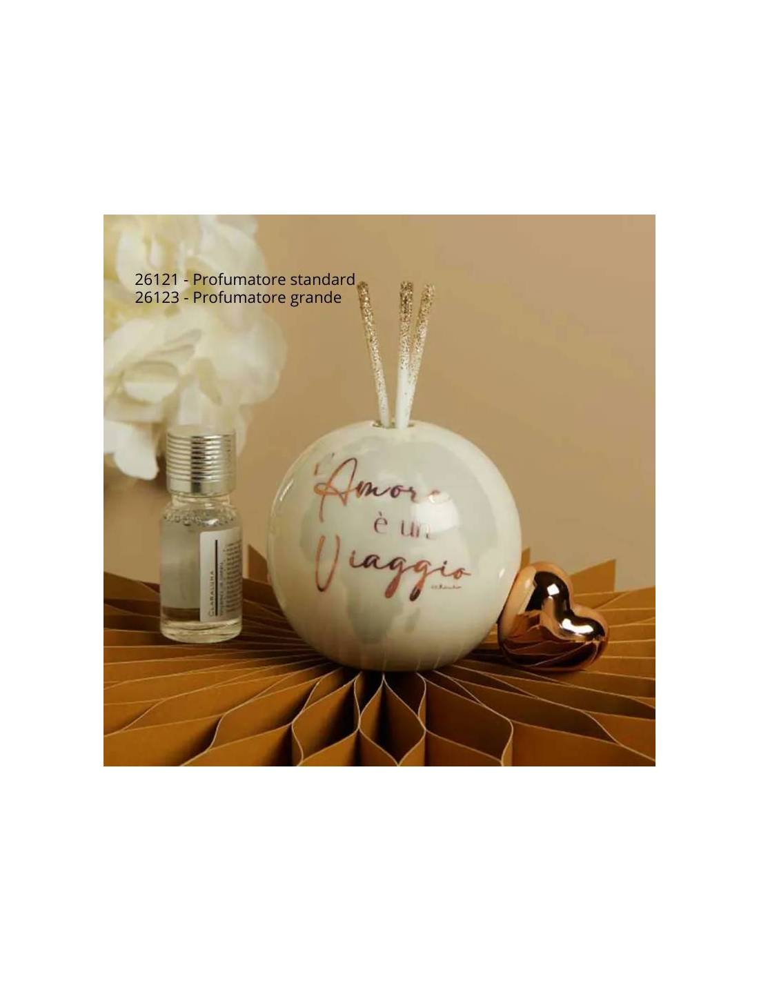 Diffusori per ambienti Matrimonio globo in ceramica con cuore dorato rosato e frase "L'amore è un viaggio".