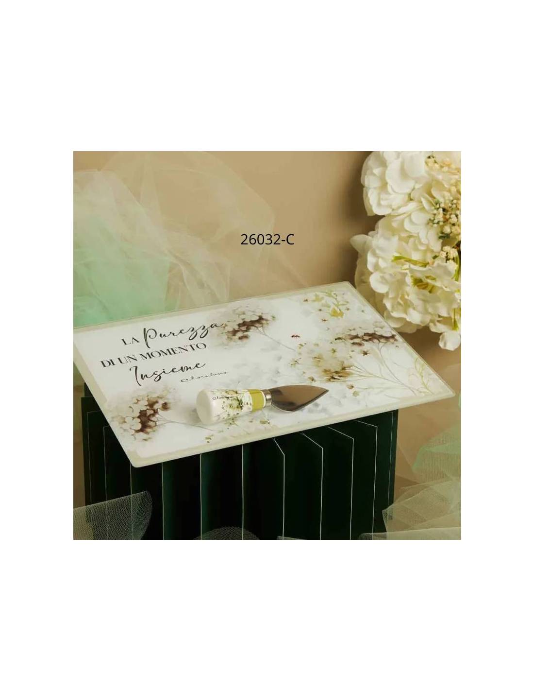 Bomboniere utili Matrimonio firmate Claraluna bellissimi ed eleganti taglieri in vetro con fantasia floreale, coltellino coordinato e frase "La purezza di un momento insieme".