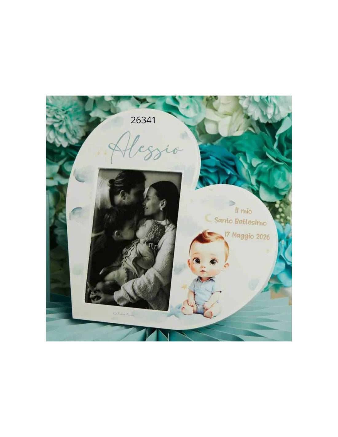 Bomboniere cuore cornice portafoto personalizzata decorata con immagine tenero bambino.