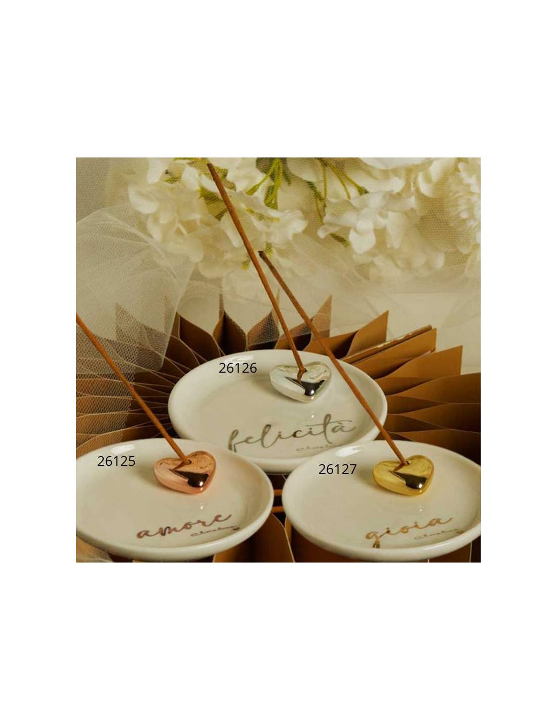 Bomboniere in porcellana bianca piattini porta incenso arricchiti con cuoricini metallizzati di vari colori con e scritte.
