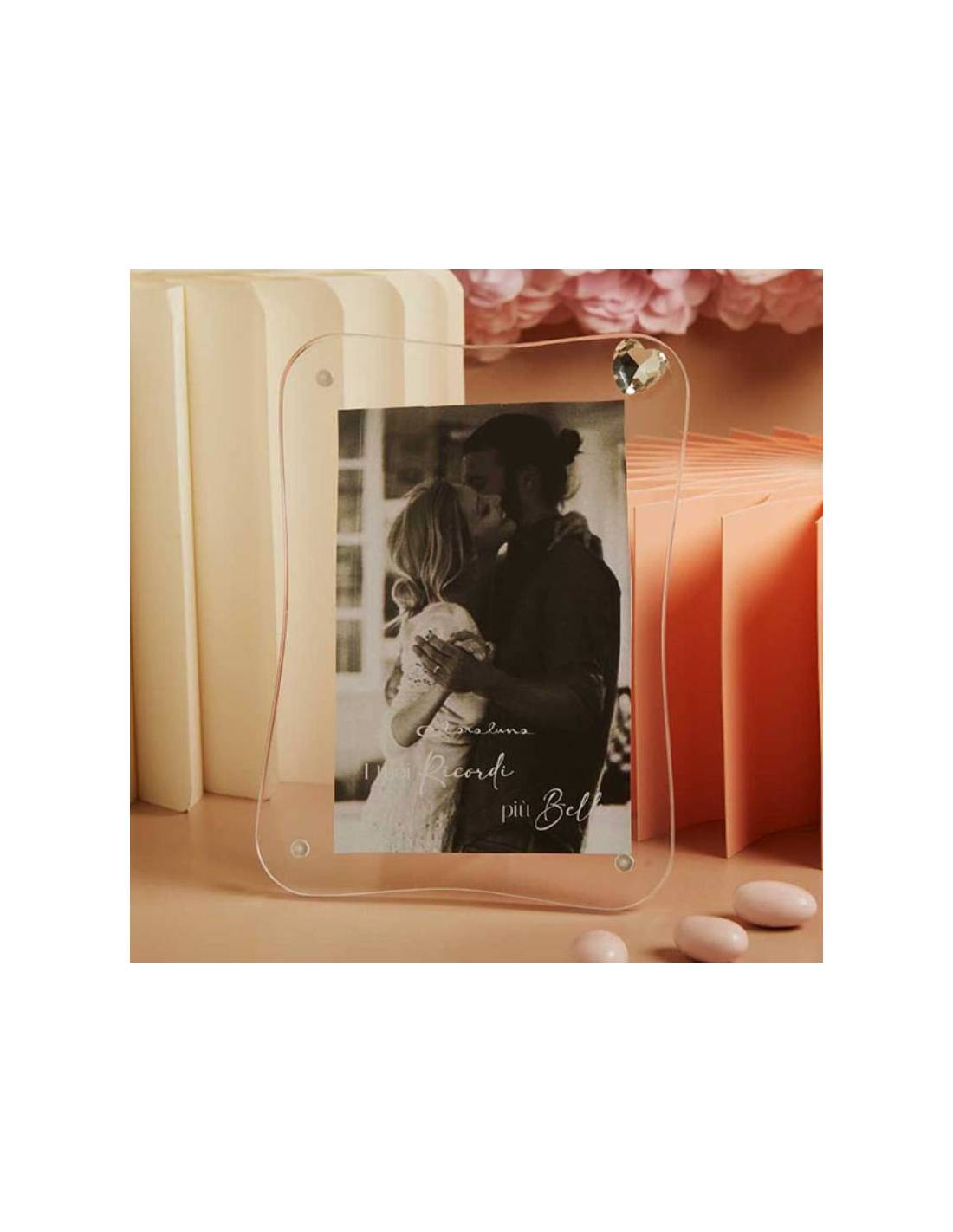 Bomboniere raffinate ed eleganti cornici portafoto in plexiglass trasparente con design moderno disponibile con o senza cuoricino.