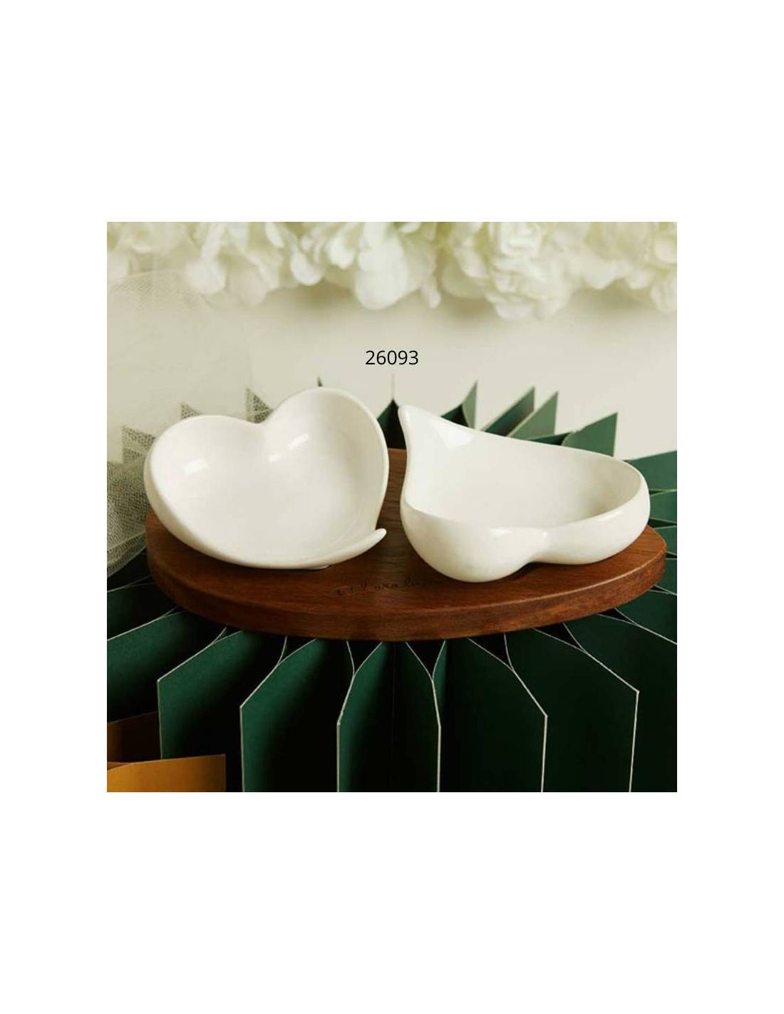Bomboniere utili vassoi in legno acacia con incluse due ciotoline a forma di cuori in porcellana lucida.