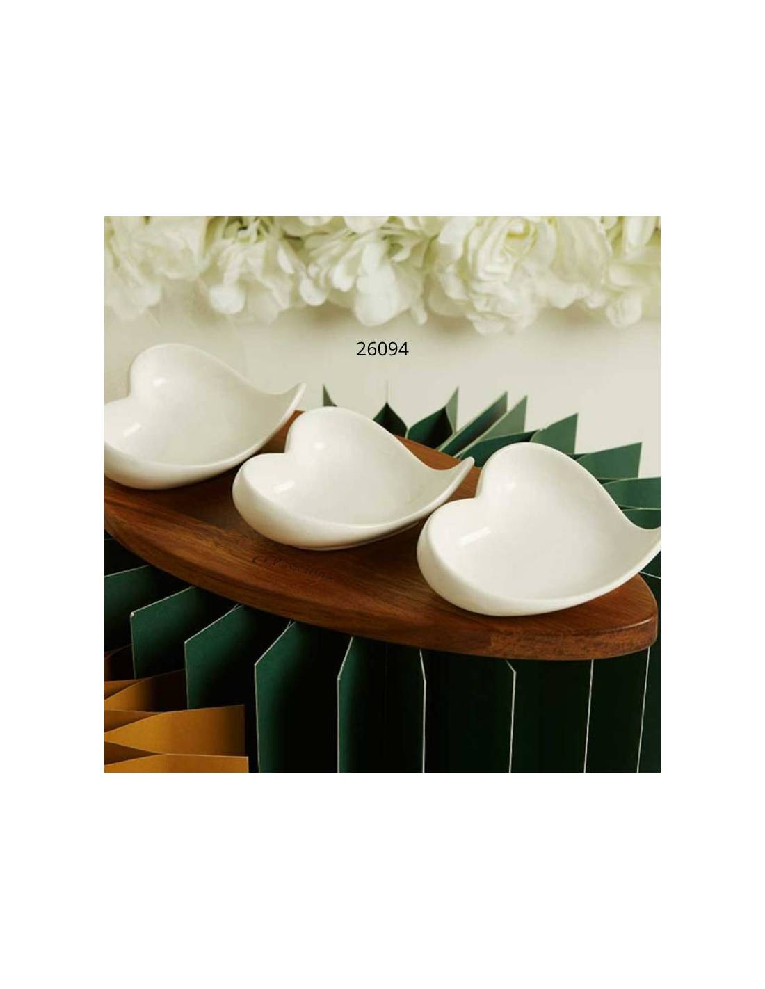 Bomboniere per Matrimonio utili vassoio in legno acacia con incluse tre ciotole in porcellana lucida bianca a forma di cuori.