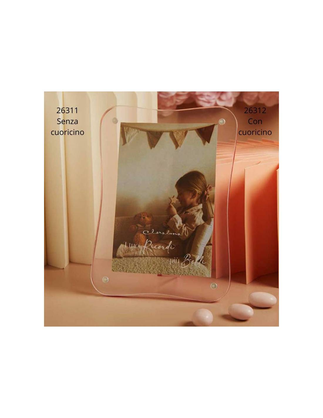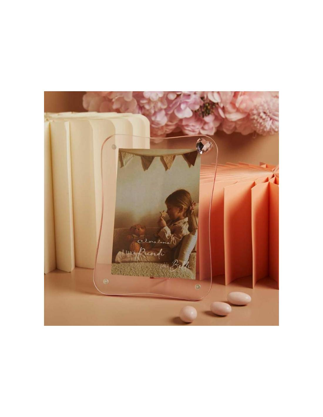 Cornici portafoto particolari ondulate in plexiglass rosa trasparente disponibile con o senza cuoricino.