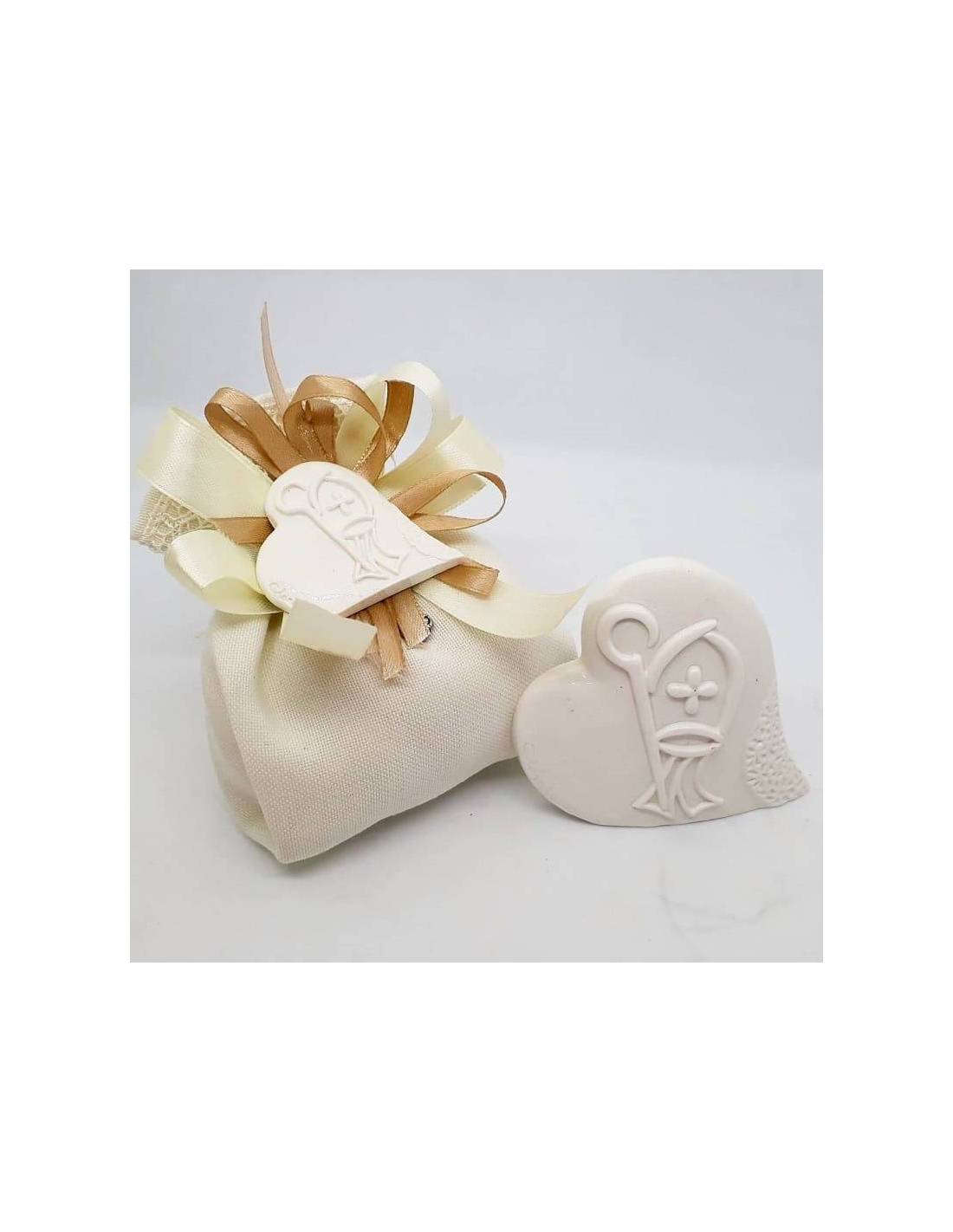 Bellissima bomboniera pendaglio a forma di cuore bianco accuratamente lavorato assortito in due varianti con rappresentazioni diverse (Dimensione: 5,5 cm circa)