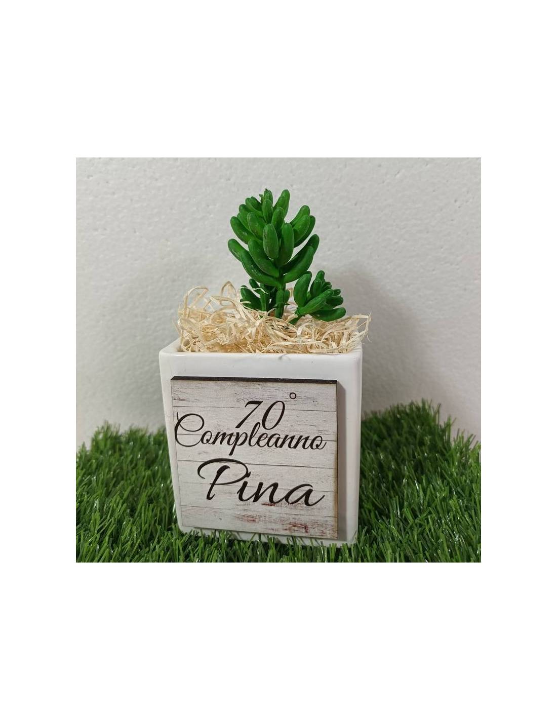 Portapiante Compleanno vasetto in ceramica bianca con applicazione in legno personalizzata.