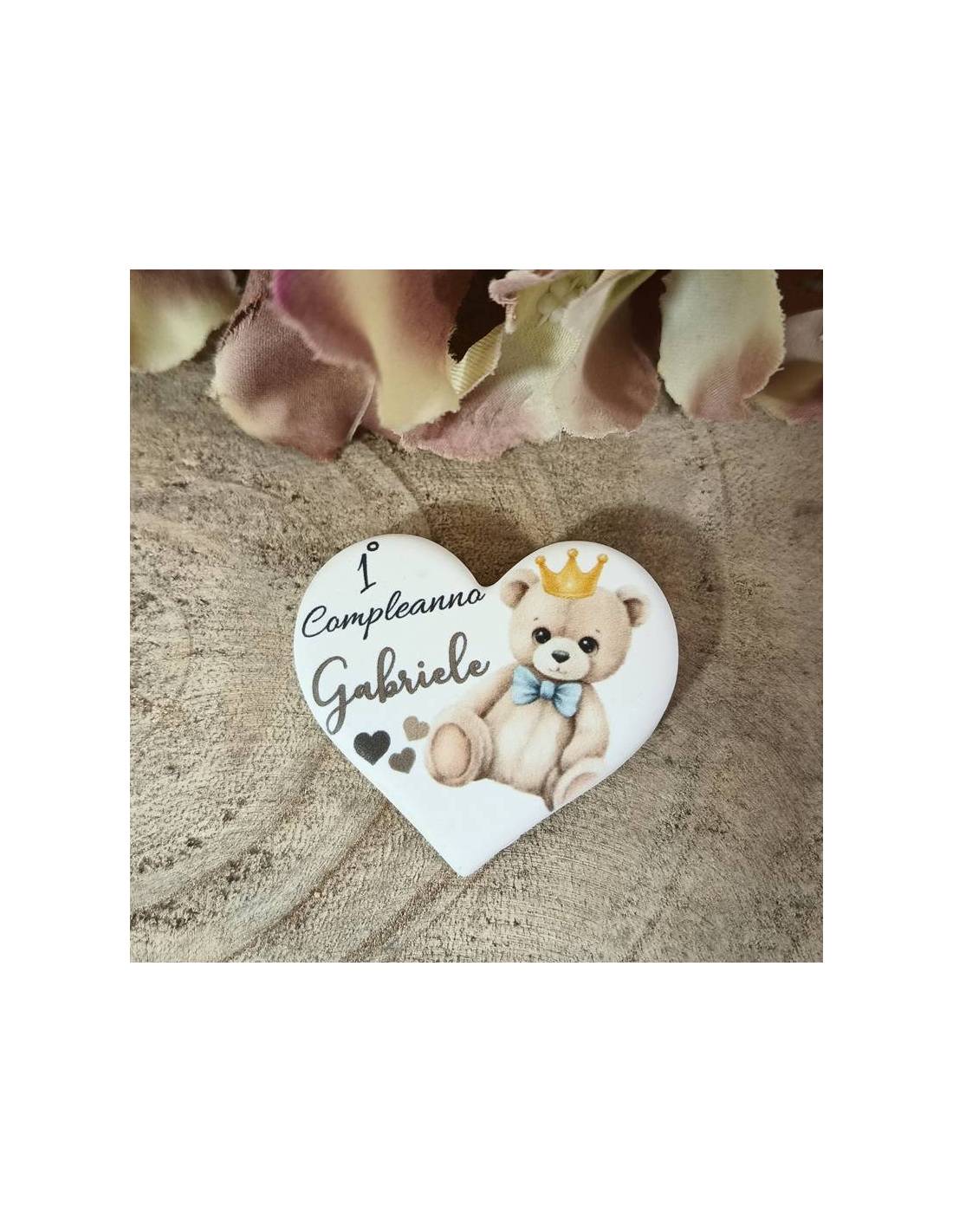 Calamite bomboniere che rappresentano cuore bianco con stampa bambi e nome personalizzato della festeggiata.