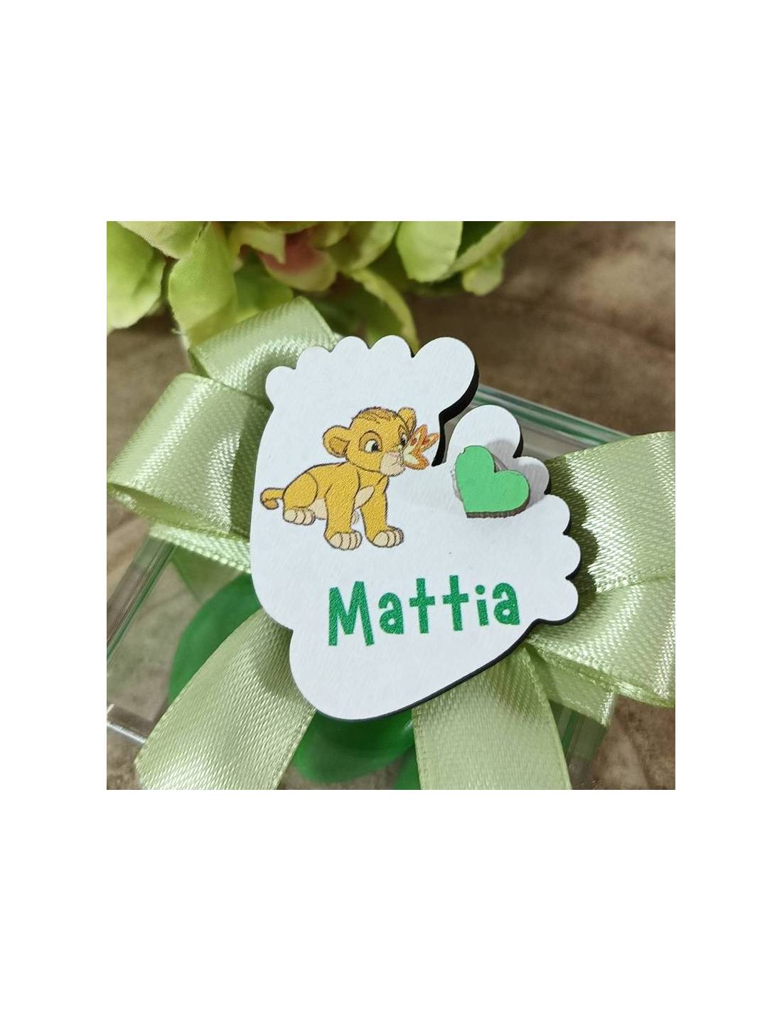 Bomboniere personalizzate magneti piedini in legno tema Re Leone Simba dettagli cuore verde.