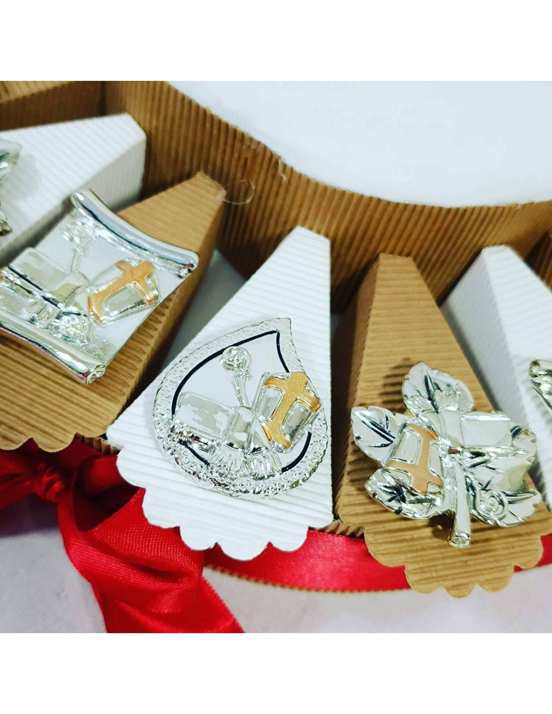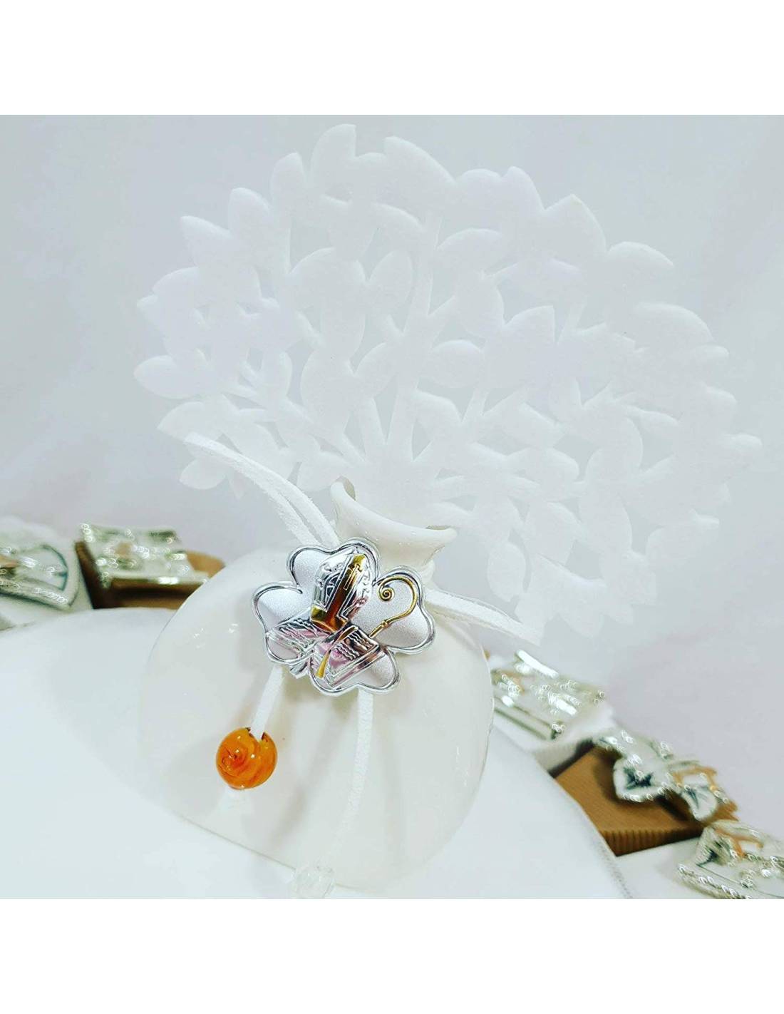 Particolare torta bomboniere per Cresima magneti argentati con Albero della Vita profumatore
