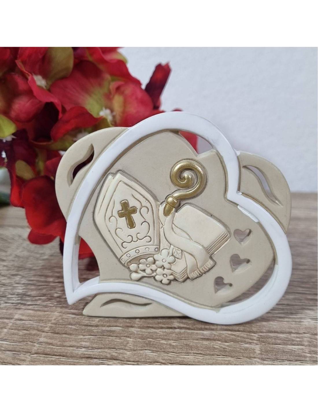 Bomboniere x Comunione e Cresima cuore con immagine sacra del calice e della mitria simboli in assoluto di questi sacramenti.