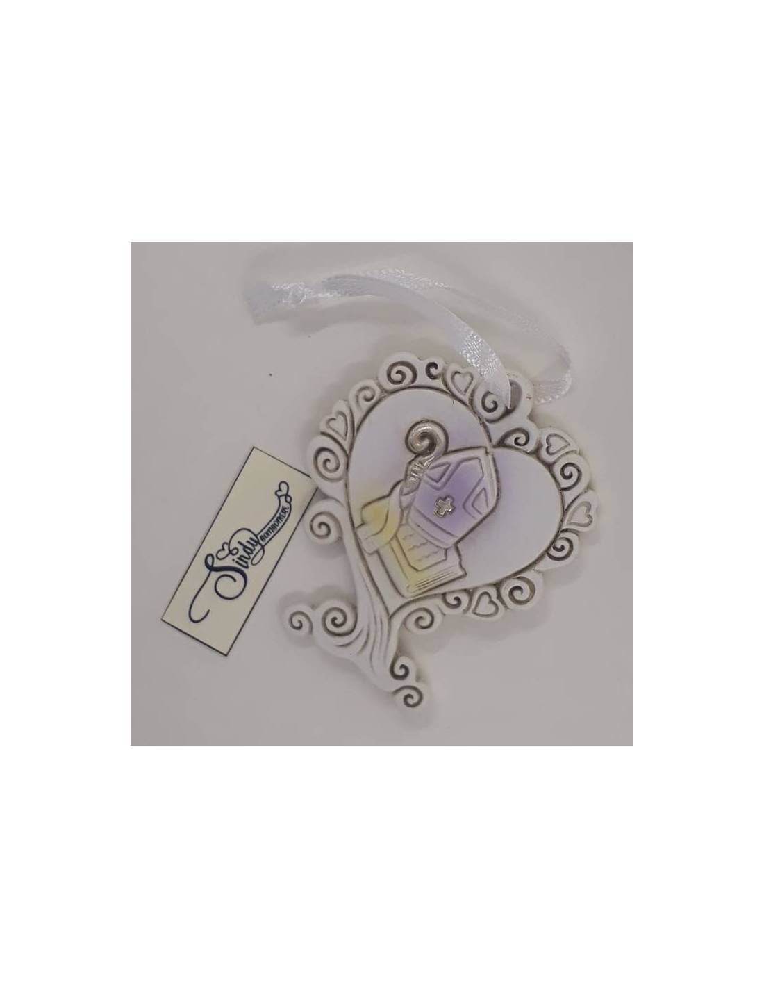 Le bomboniere di Angie cuore bianco con rami albero della vita e in rilievo immagine sacra dell'evento.