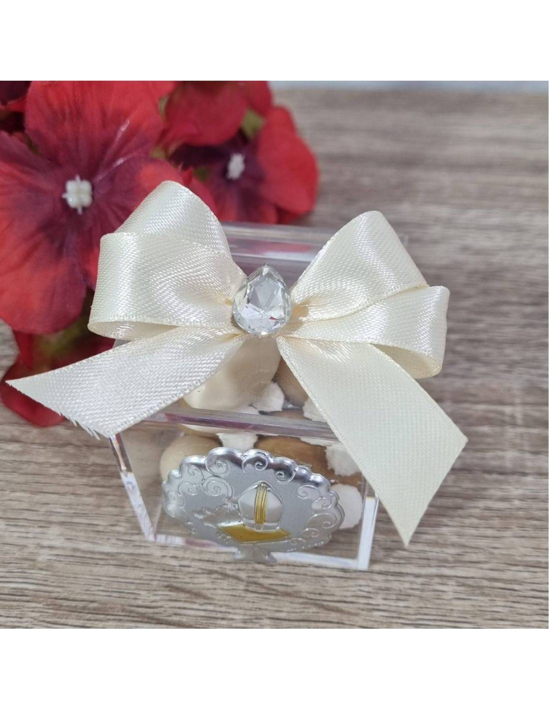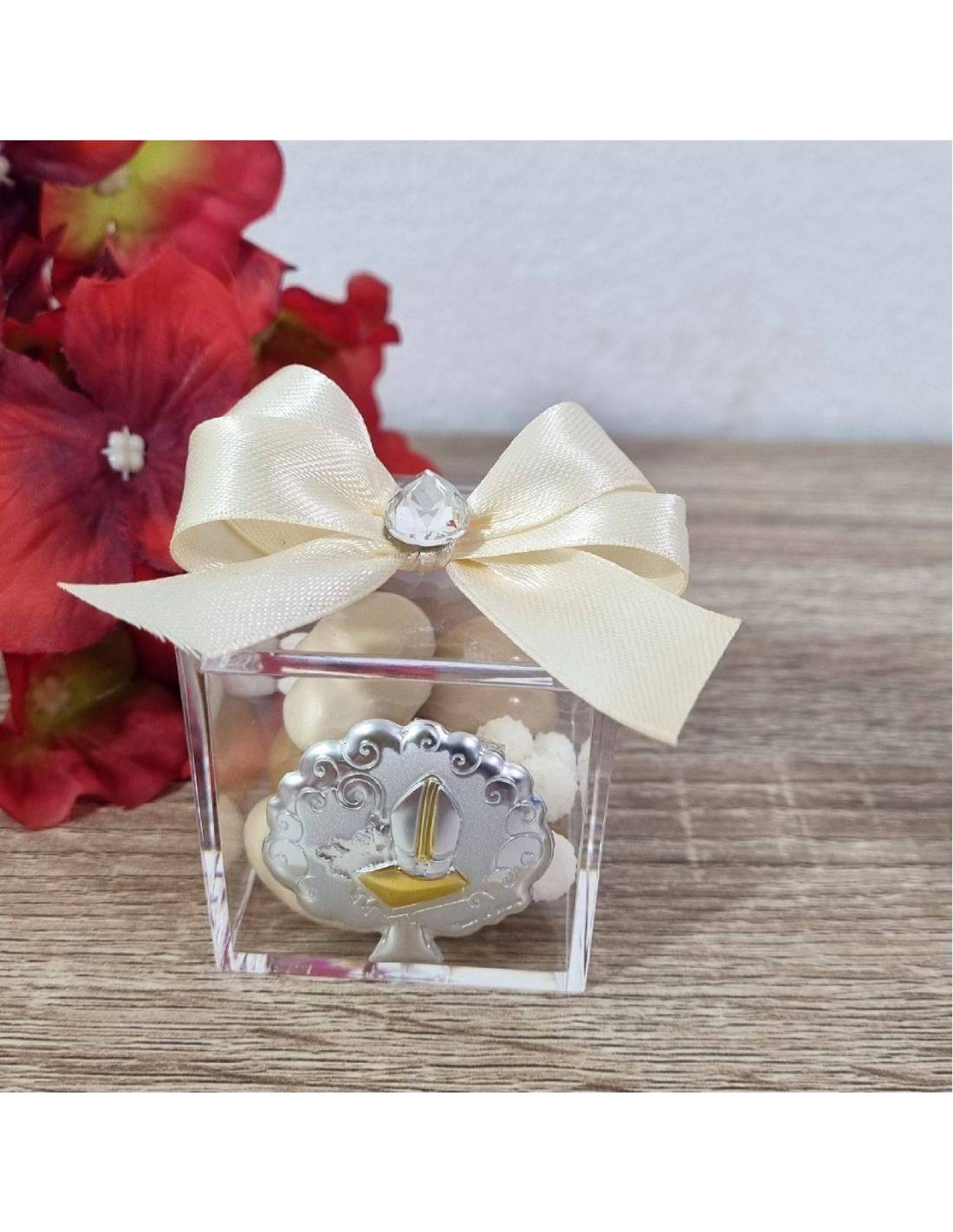 Originali bomboniere Cresima da regalare con deliziosi confetti nella scatolina di plexiglass con placca in argento albero della vita e fiocco con charm diamante.