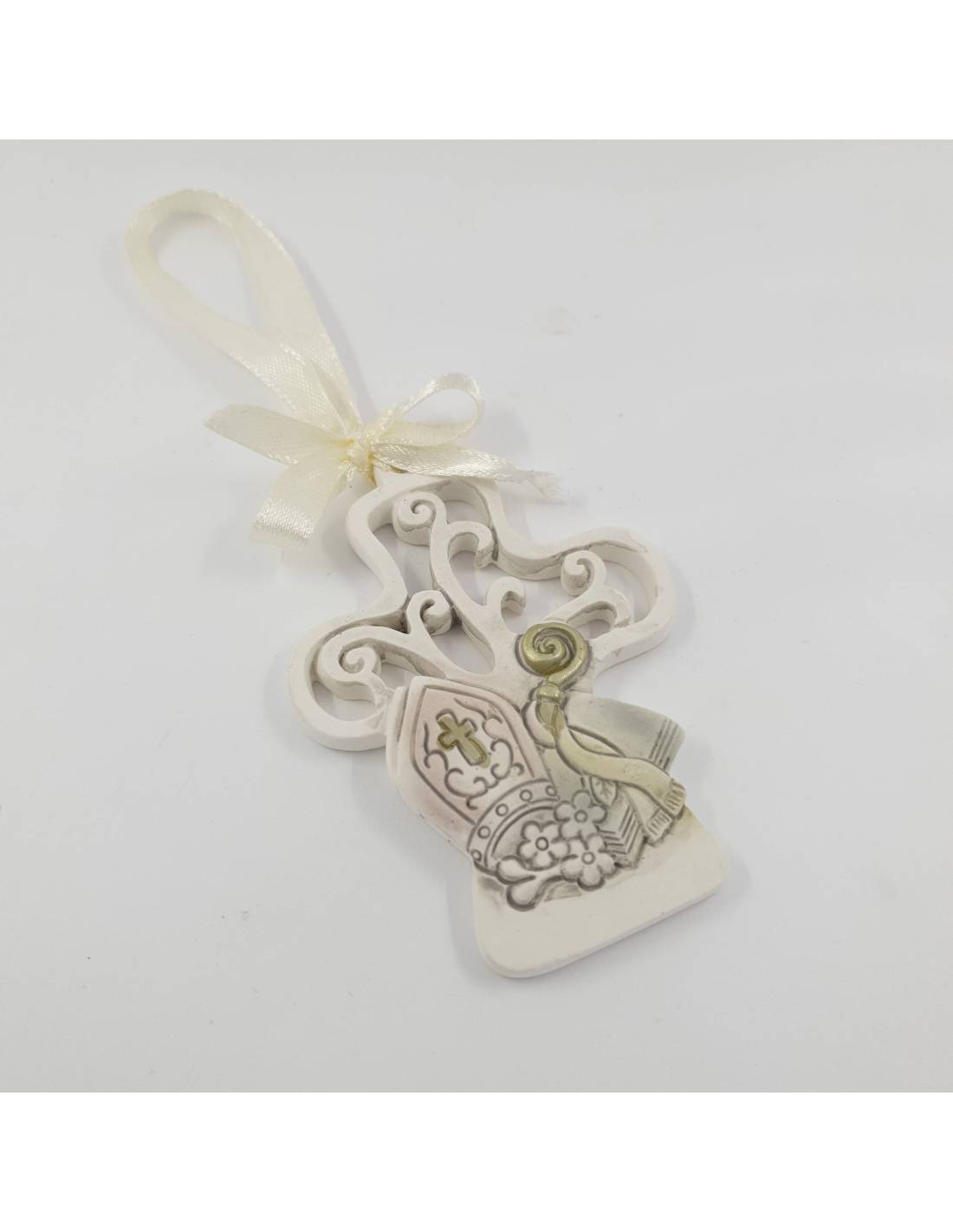 Croce stilizzata al centro l'immagine sacra della cresima in rilievo compresa di nastro, oggetti sacri che si prestano bene a realizzare delle bomboniere cresima economiche.