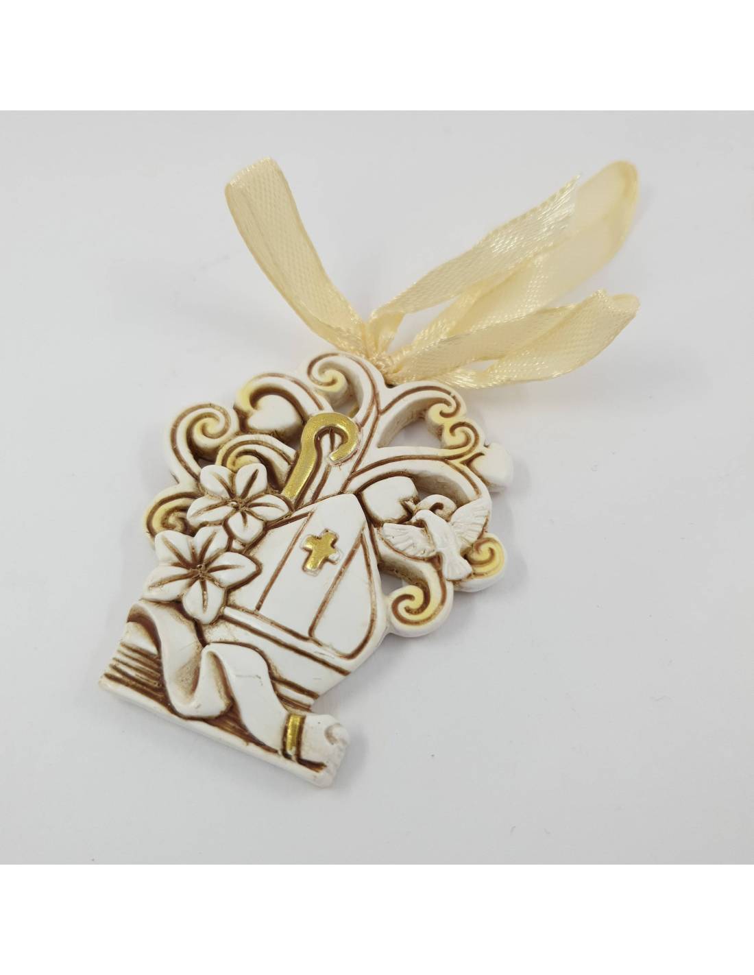 Pendente albero della vita con mitria e il bastone del vescovo, dai colori panna con dettagli dorati e nastro incluso, economiche bomboniere cresima