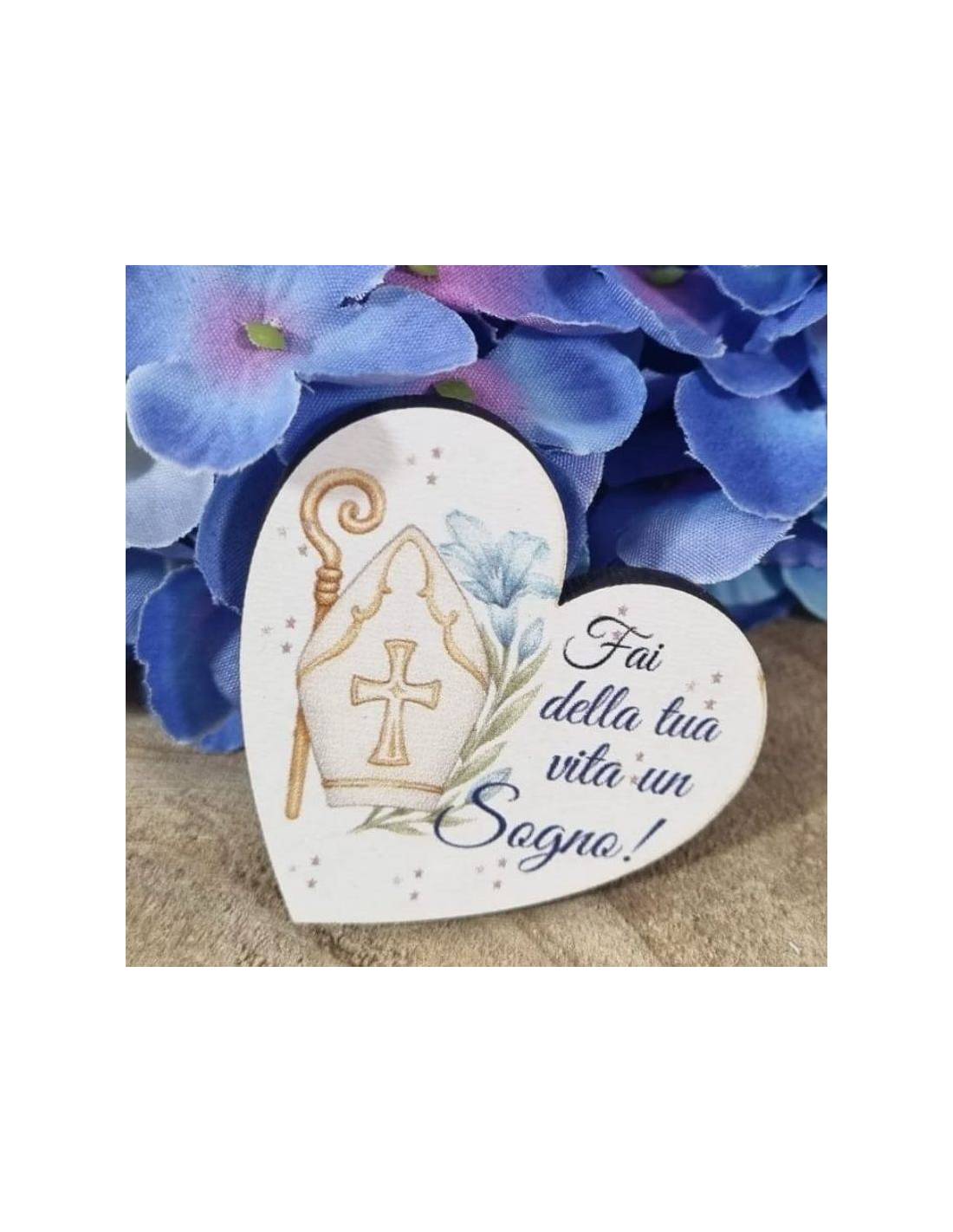 Il cuore in legno a calamita con l'immagine sacra della mitria e il cappello del vescovo.