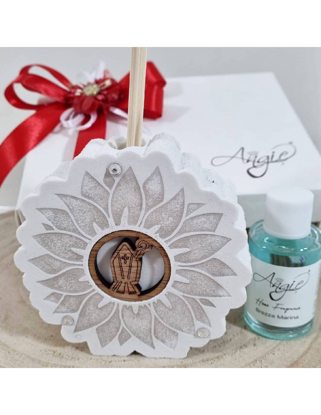 Idea originale questo profumatore bomboniere con la parte d'avanti in legno con l'incisione della mitria e la scritta "Santa Cresima" con il nome del festeggiato/a.