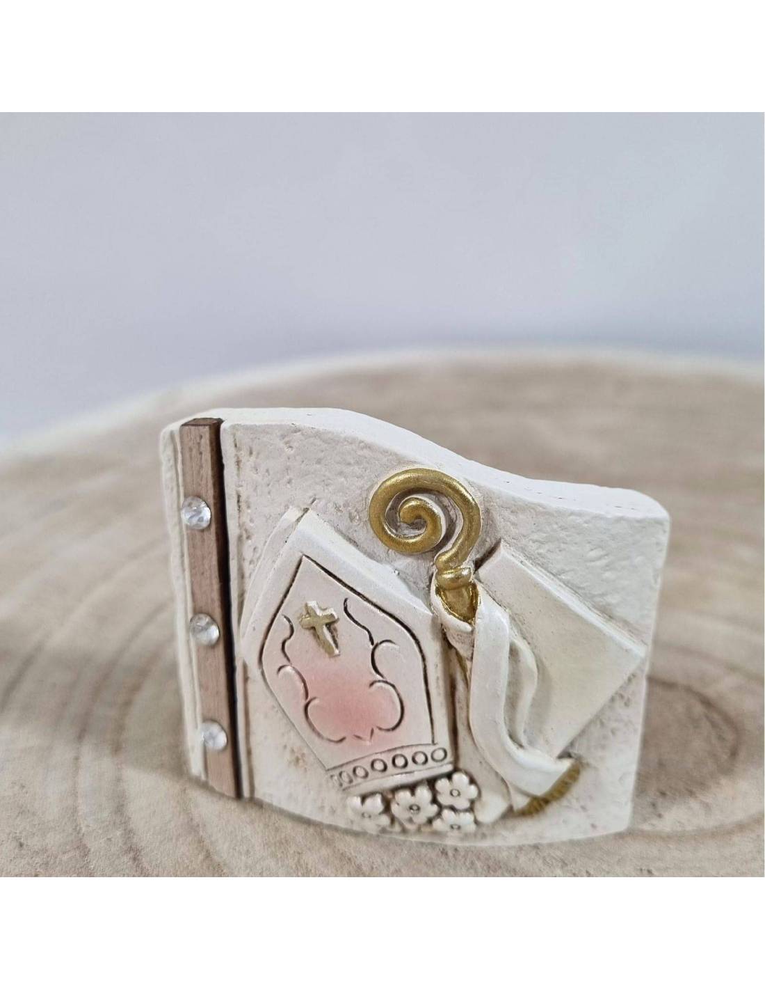 Bomboniere Cresima fai da te statuette in pietra leccese dalle linee moderne in rilevo l'icona sacra della mitria e il bastone con dettagli dorati.