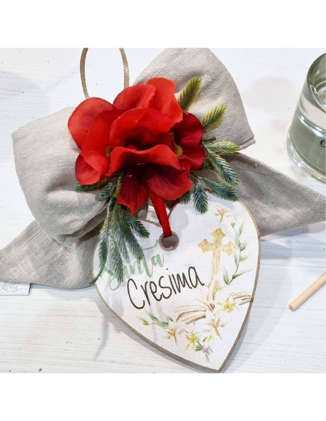 Fiocco bomboniere per cresima decorato con fiore artificiale fotorealistico rosso arricchito con pendente bomboniera per cresima con stampa su legno.