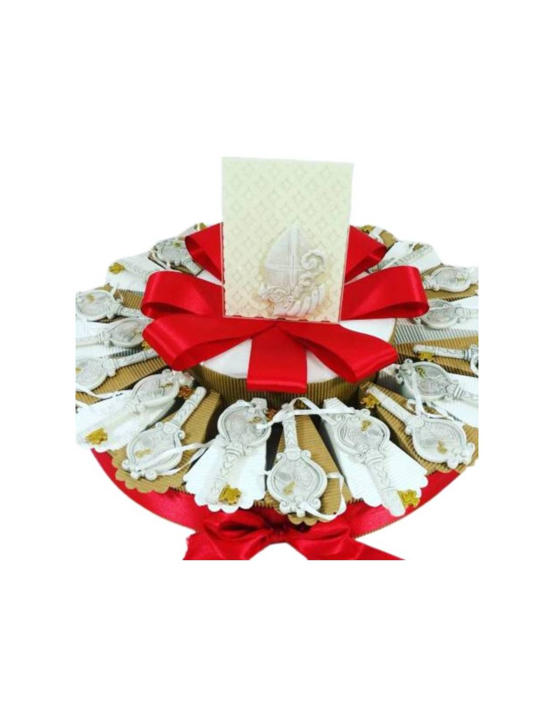 Bomboniere per Cresima su torta con chiave con simboli Sacri e bomboniera centrale di Carlo Pignatelli.