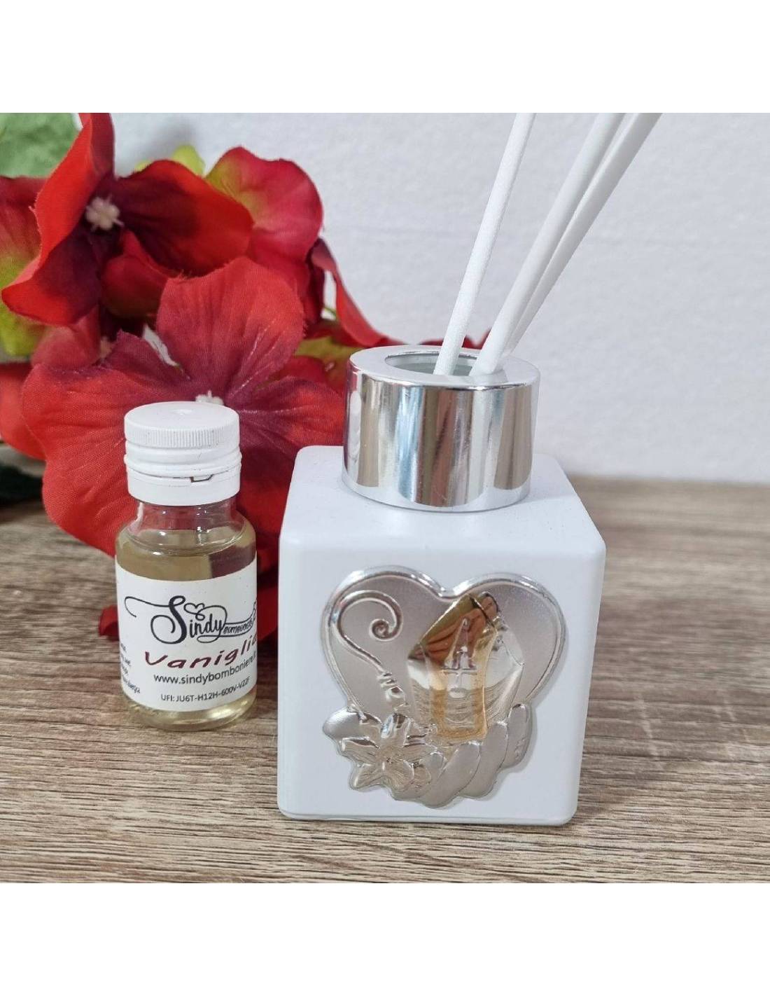 Bomboniere profumatori Cresima boccetta bianca molto elegante decorata con placca in argento che raffigura un cuore in una mano e in rilievo l'icona sacra di questo sacramento.