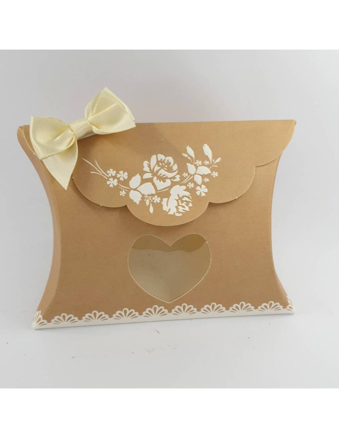 Scatola in cartoncino a forma di lettera di colore marroncino con fessura a forma di cuore con decorazioni bianche raffiguranti rose. La scatolina è adatta per eventi come matrimonio, anniversario, cresima, comunione, ...