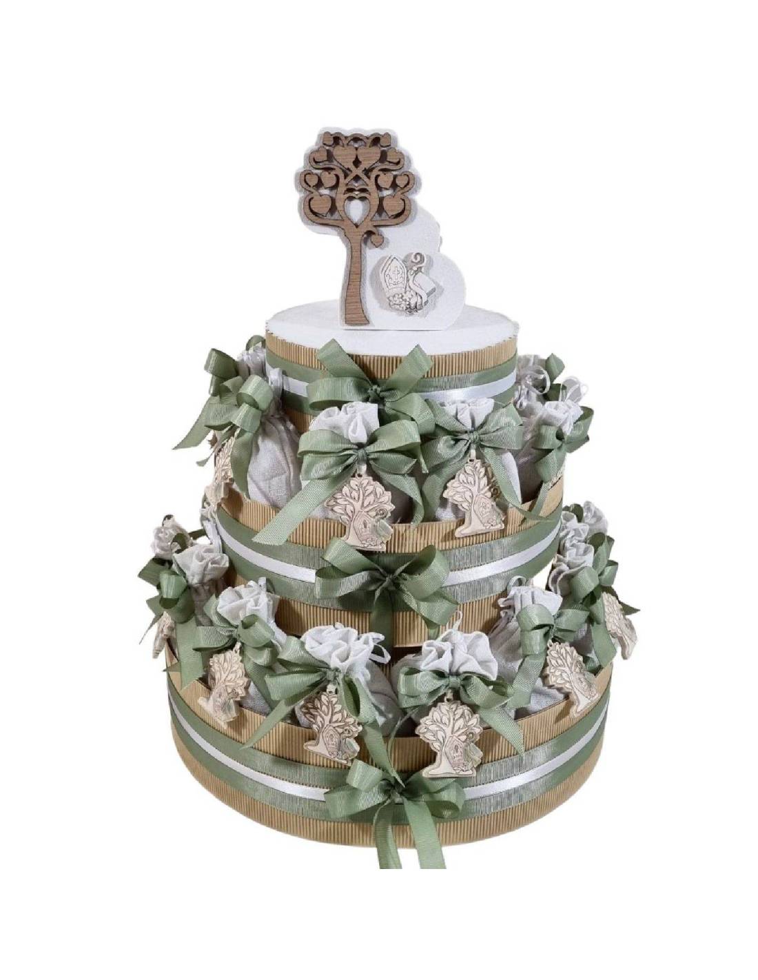 N.B. La torta arriverà montata e decorata con nastri come in foto, ma le fette verranno inserite da voi, facili da chiudere inserendo i confetti (5 confetti al cioccolato in blister per alimenti sigillato da una macchina confezionatrice IGIENE AL 100%) e poi con un pò di colla potrete attaccare gli oggetti autonomamente (consigliato colla al caldo, colla tipo attack o biadesivo) tutto questo per garantire l’integrità del prodotto.