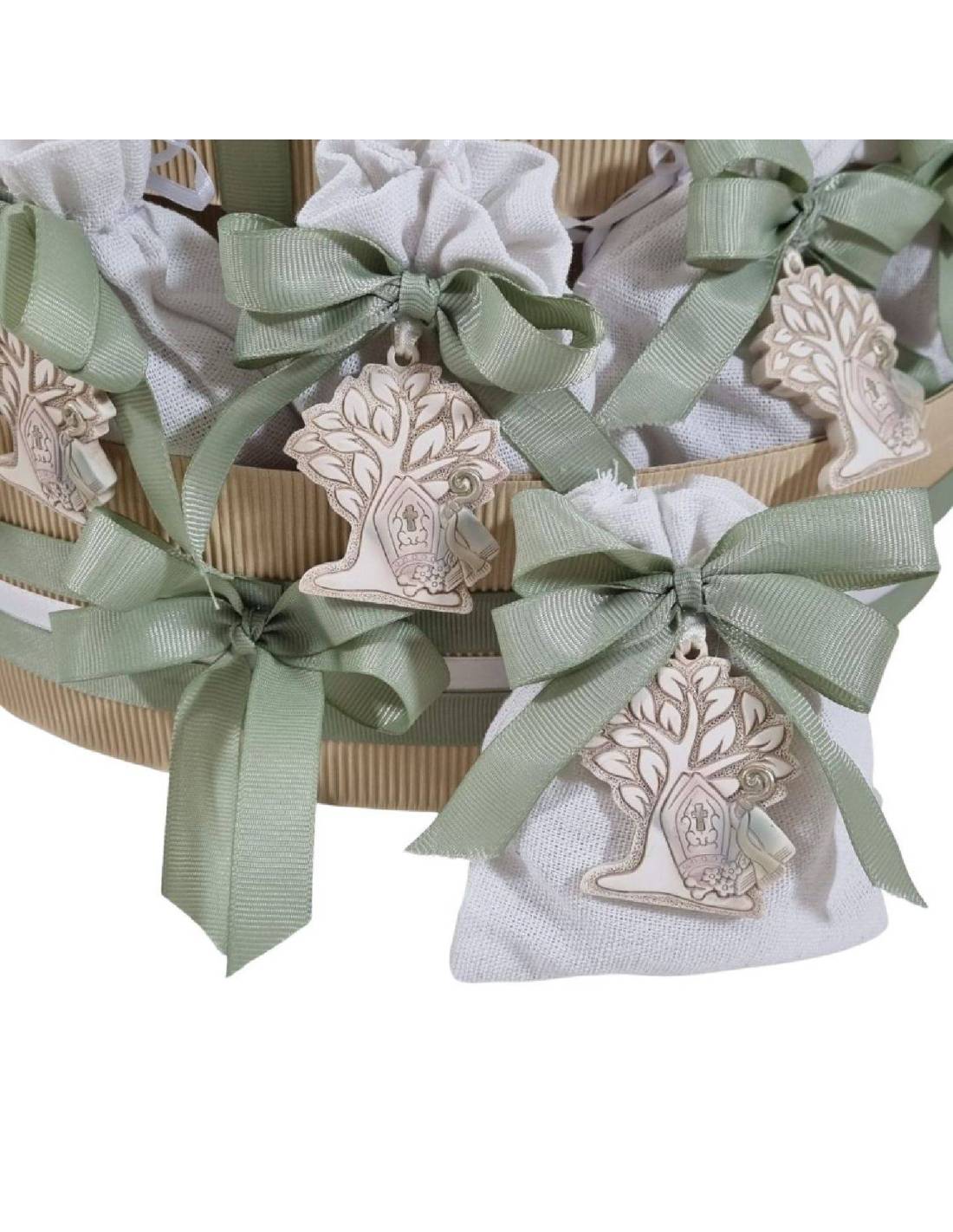 Sacchetti Cresima ovattati con fiocco e oggettini a forma di Albero della Vita in resina, raffiguranti una mitra, scettro da vescovo (dimensione 4,5 cm circa).